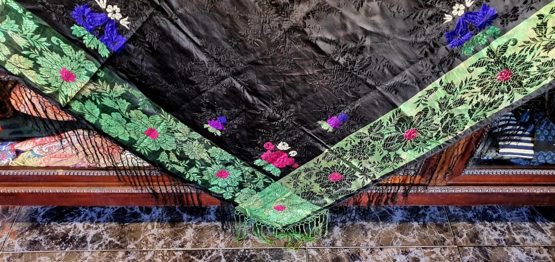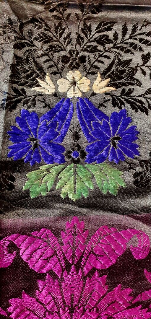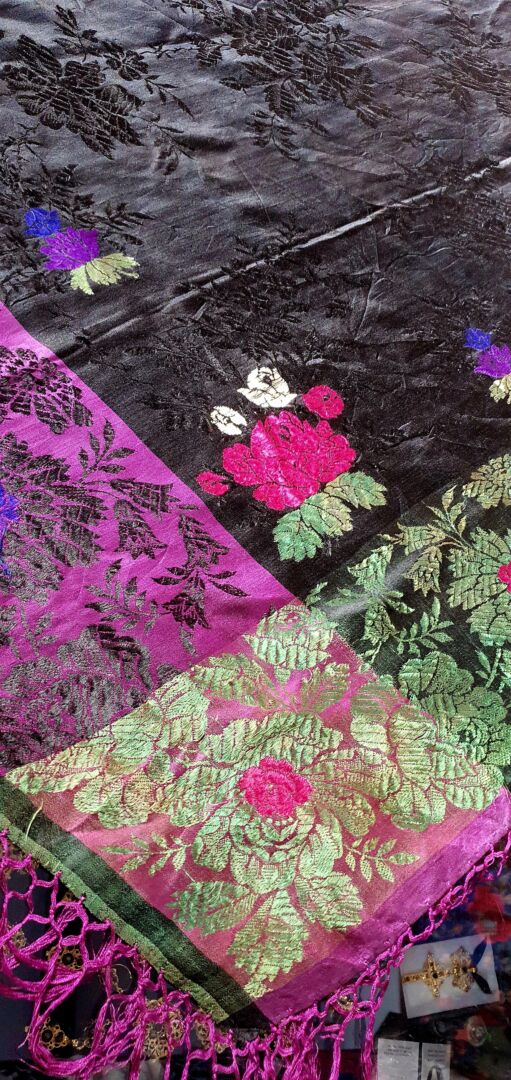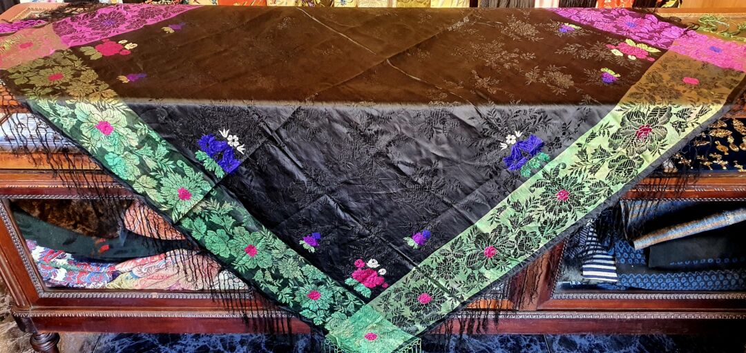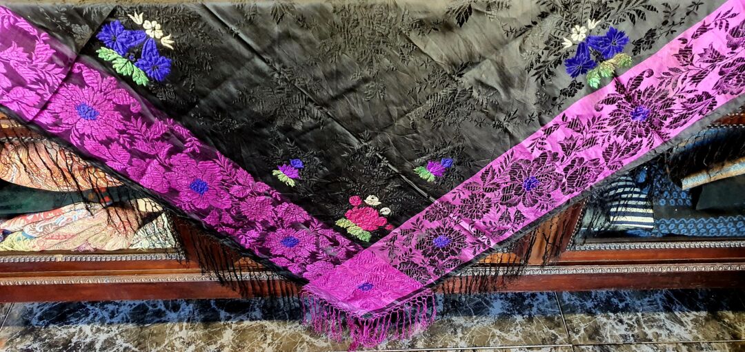 Mantón antiguo de seda adamascada y espolinada