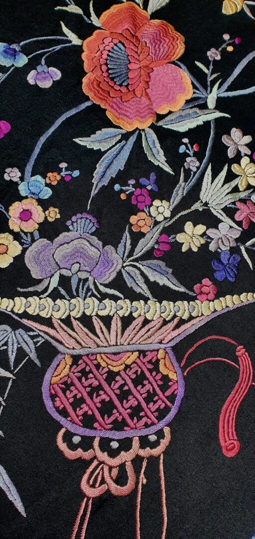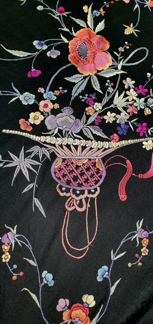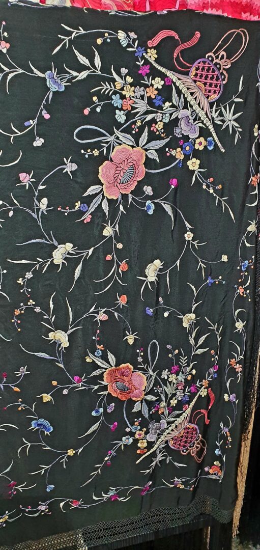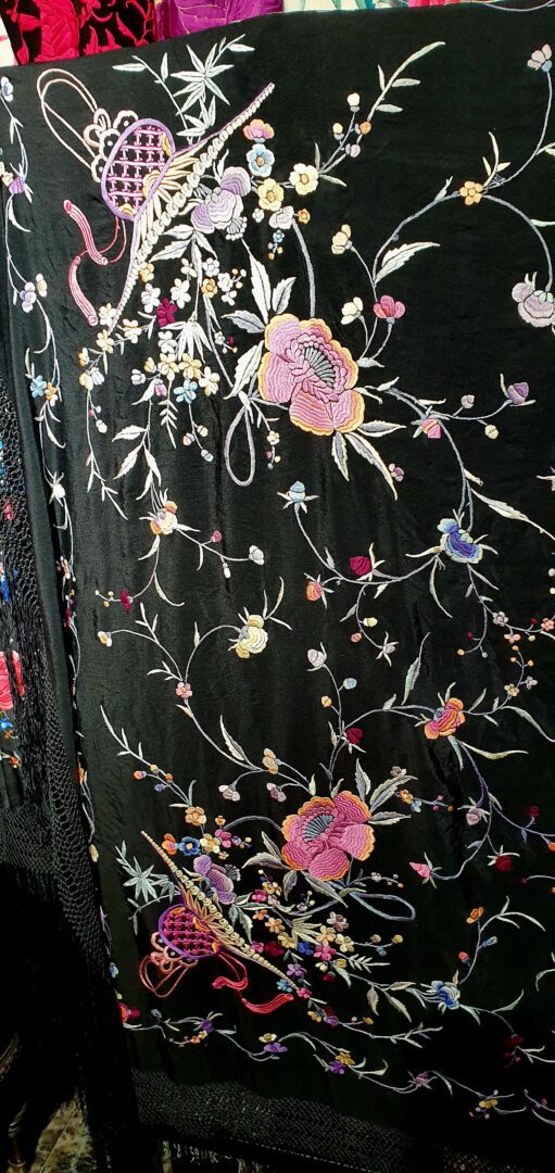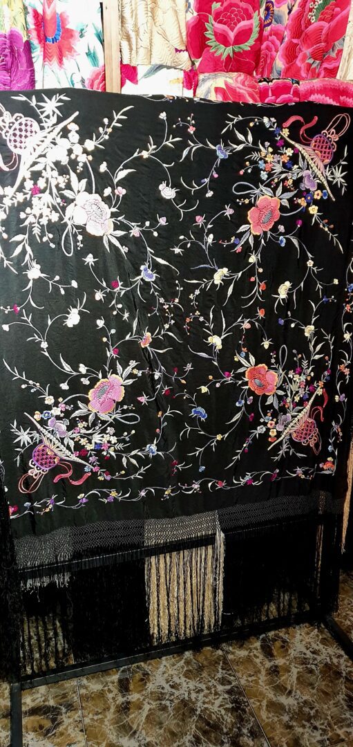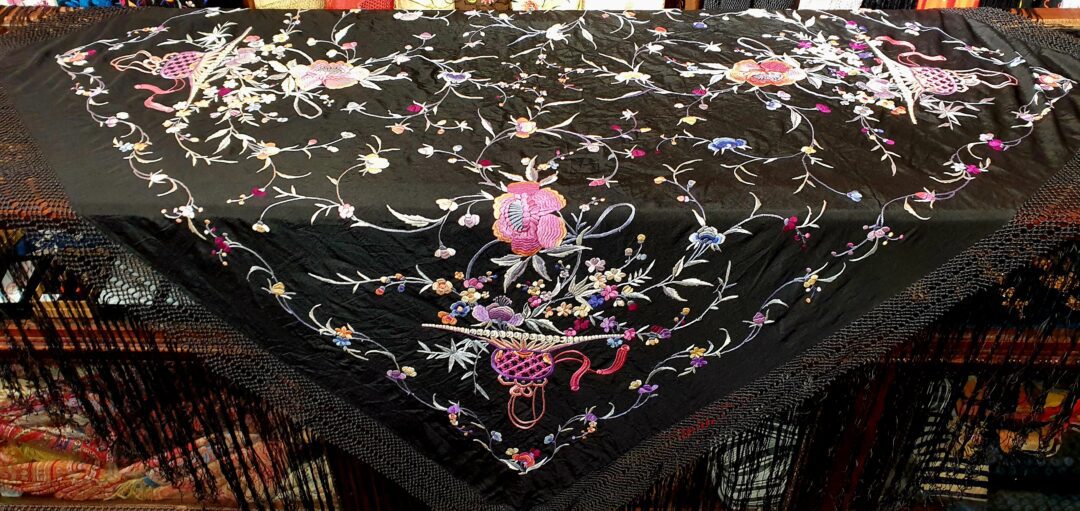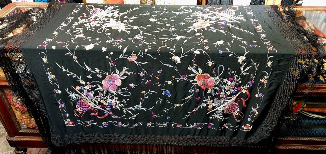 Una auténtica delicia de mantón, seda bordada a mano en 1890 – 1900. Cuatro cestos de la abundancia siguiendo los modelos de los mantones imperio. Un mantón que no pesa, manejable, con movimiento. Fleco largo de seda. Ideal para lucir en eventos o de flamenca. Mide 117 cm de lado más enrejado y fleco