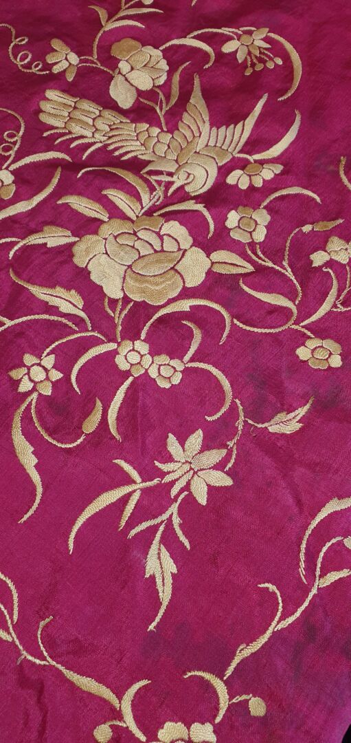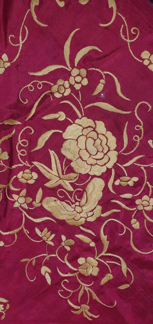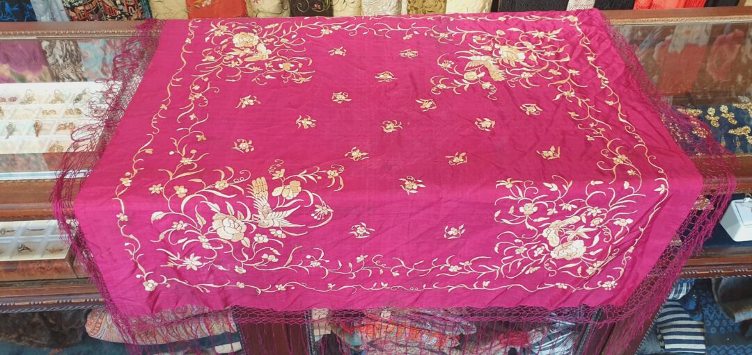 Maravilloso mantón antiguo isabelino de talle. Seda bordada a mano en 1860. Fondo color buganvilla bordado en oro.