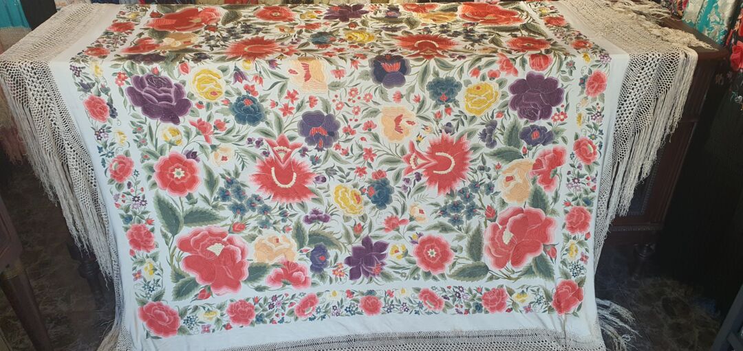 Impresionante mantón antiguo de tulipán. Seda bordada a mano en 1890. Colores suaves, elegantes. Mide 1,60 m de lado más enrejado y fleco. Muy bien conservado