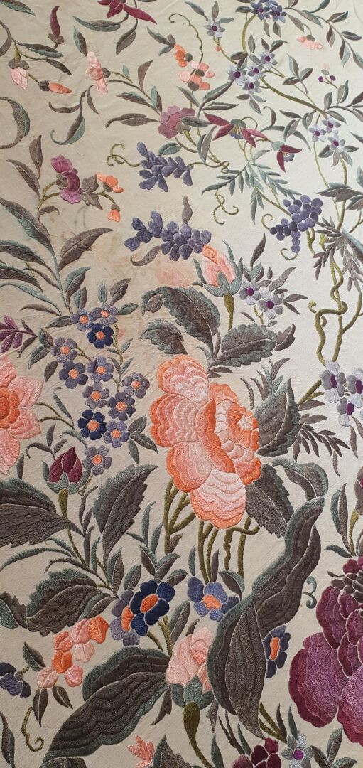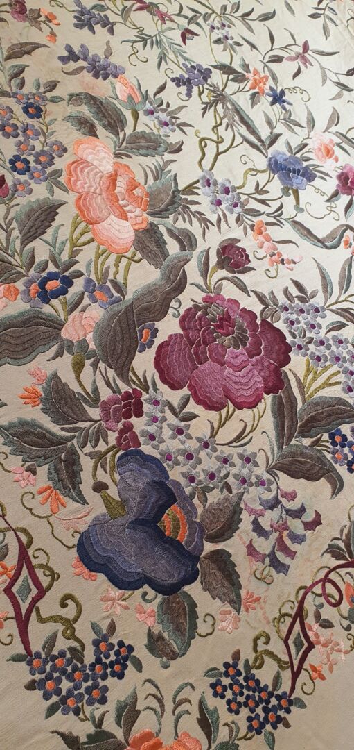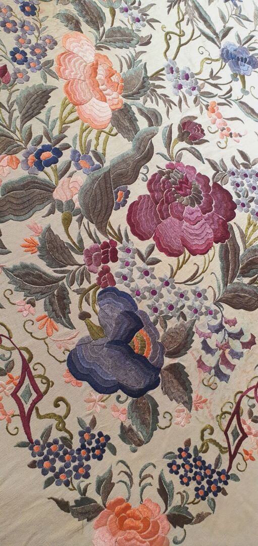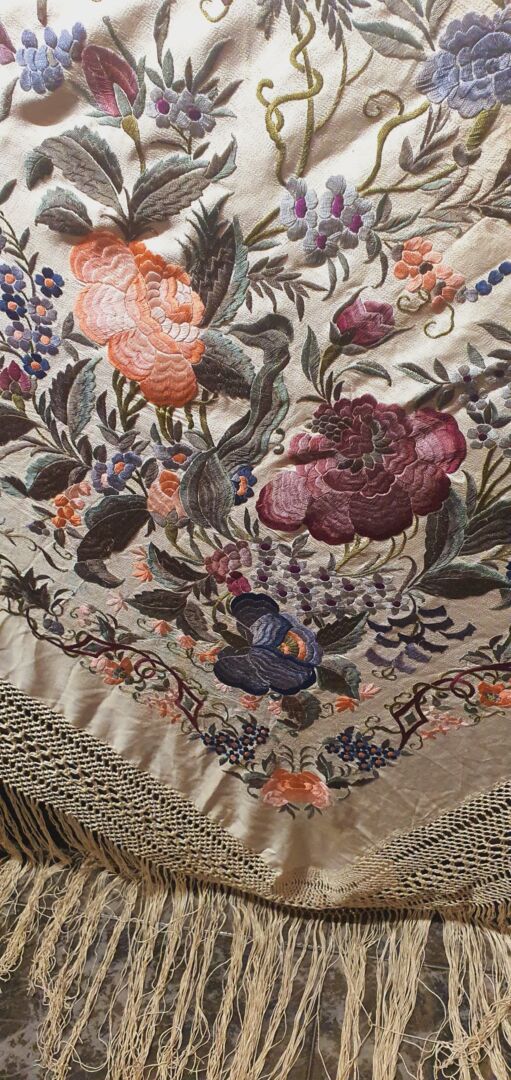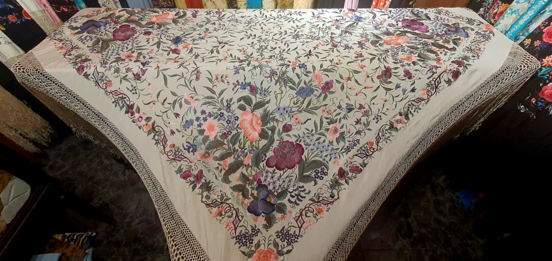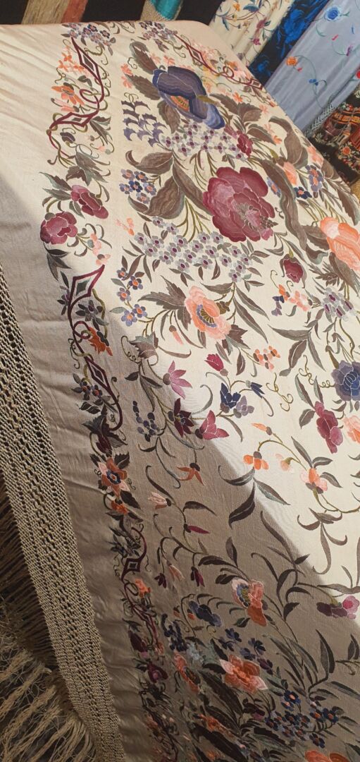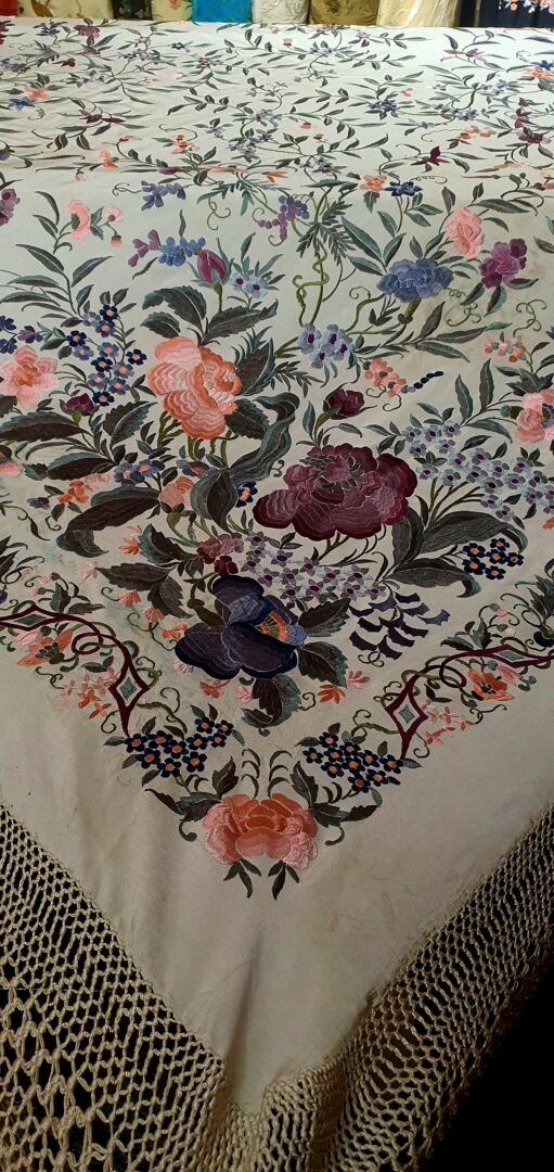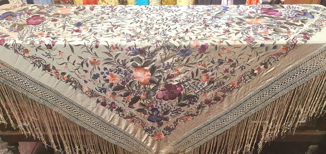 Maravilloso mantón antiguo isabelino tardío, fondo beige bordado en unos volores únicos, grises, rosas…