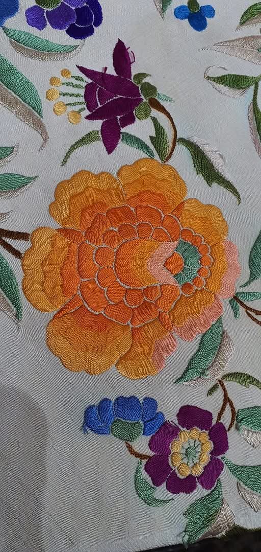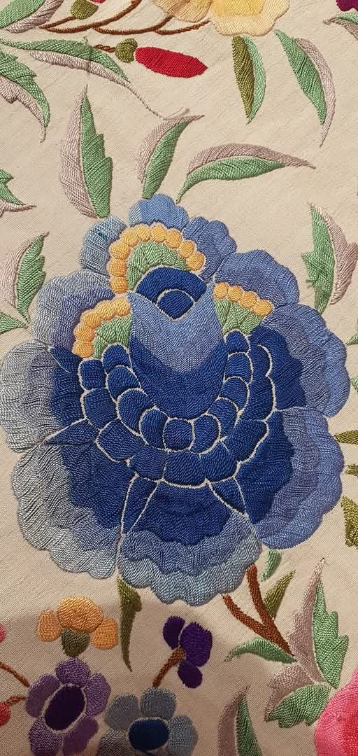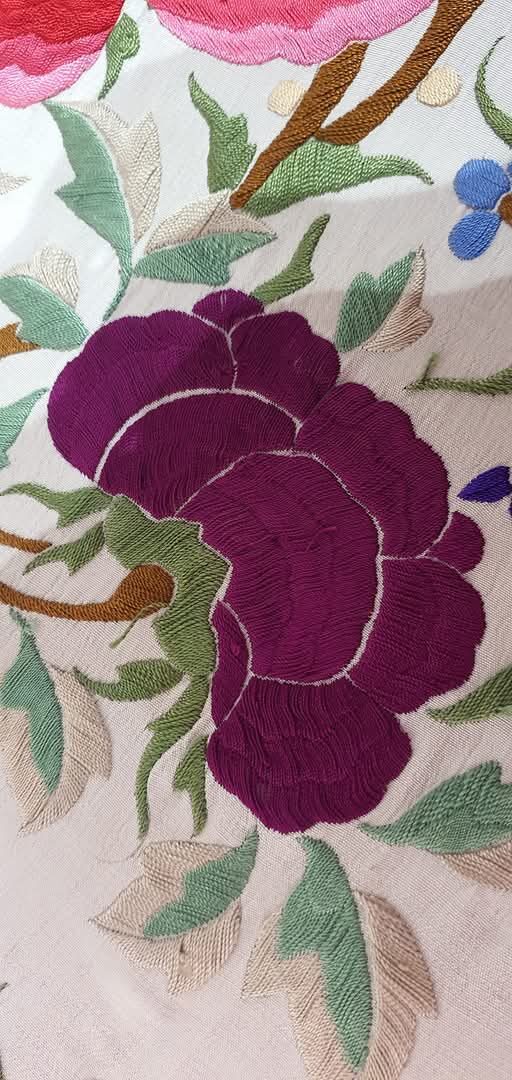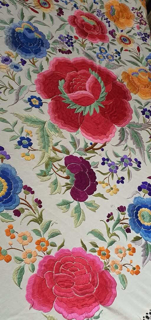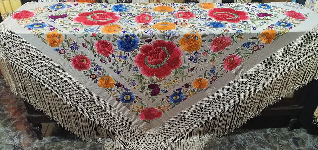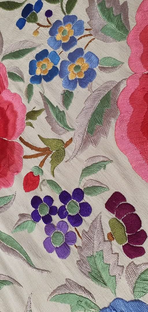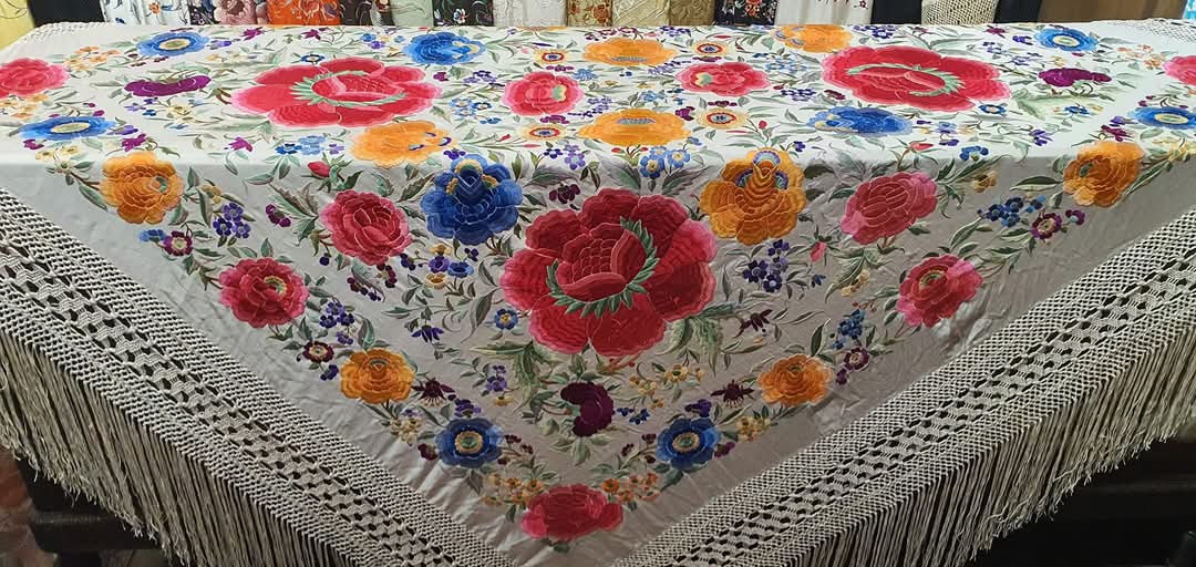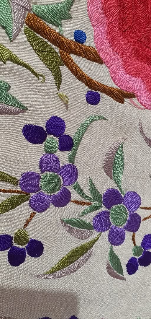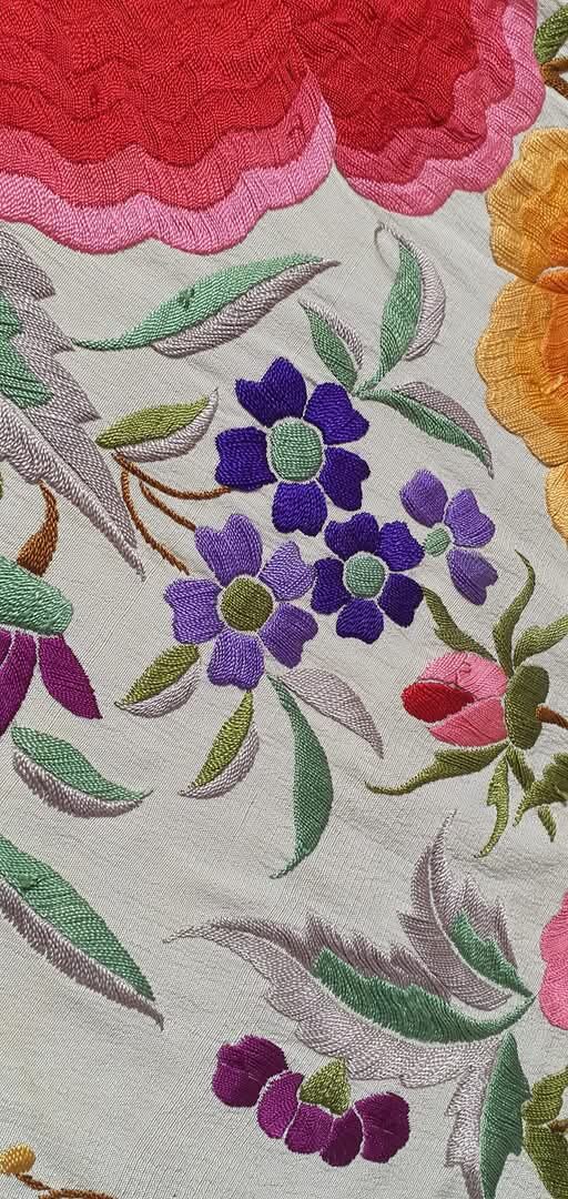 Maravilloso mantón antiguo, seda bordada a mano en 1890. Excelente conservación. Mide 1,60 m de lado más enrejado y fleco