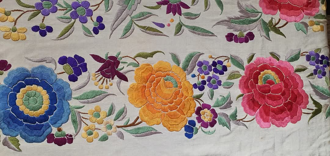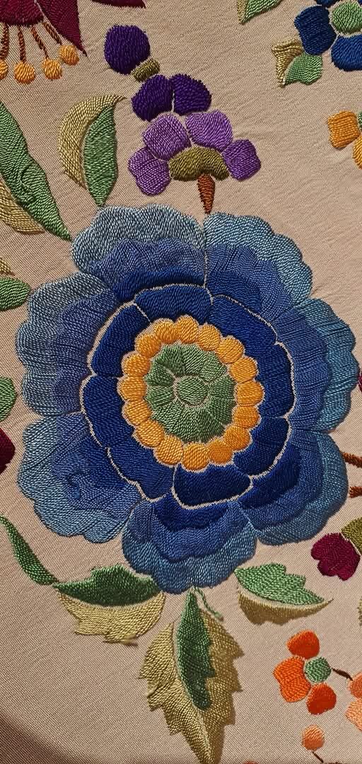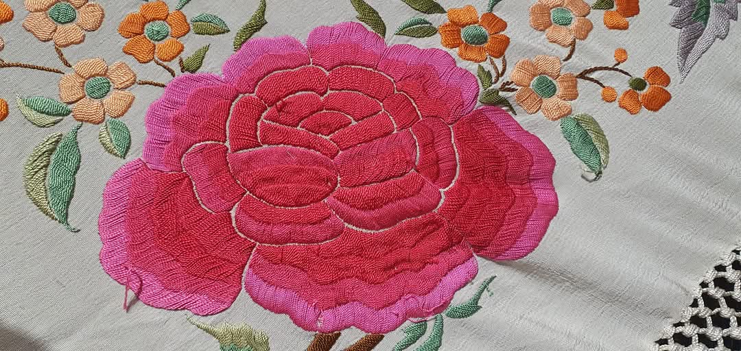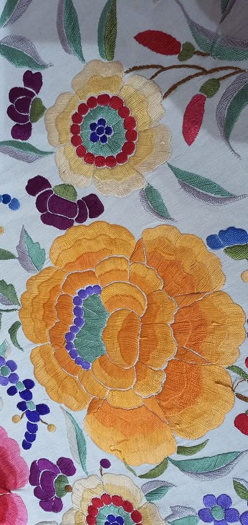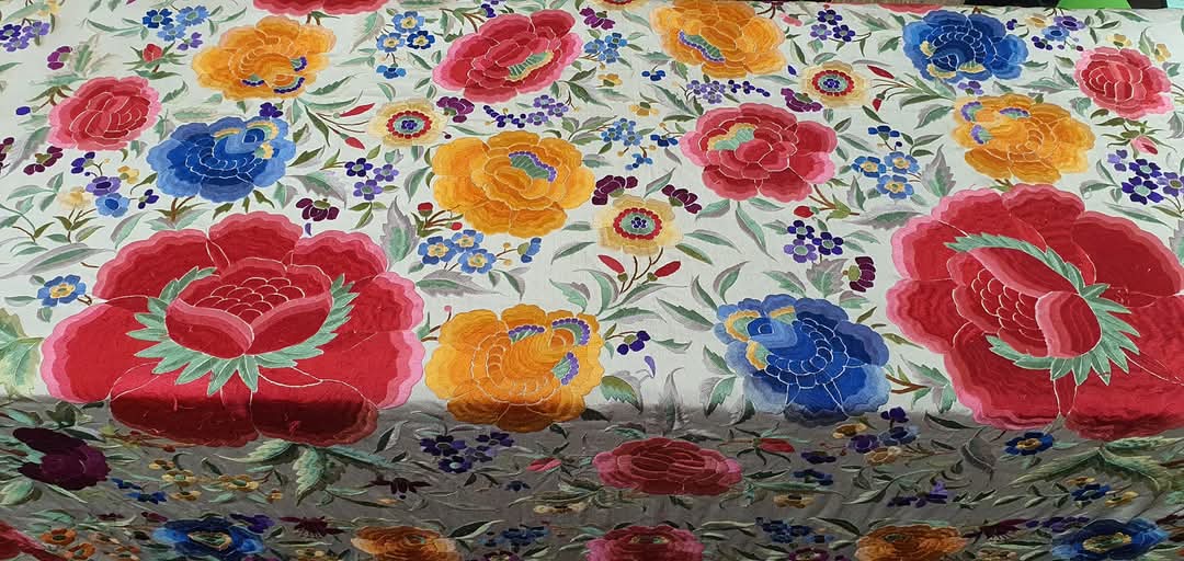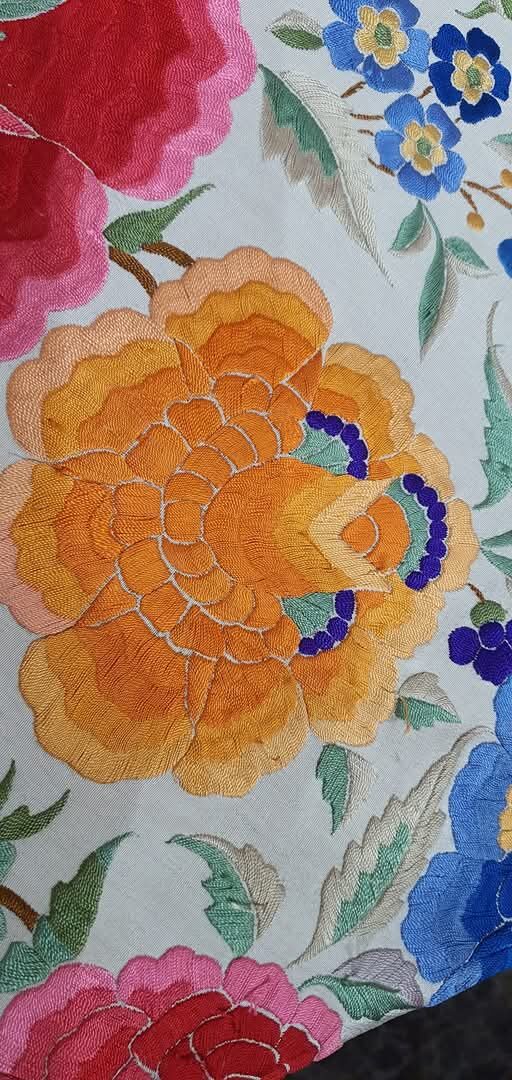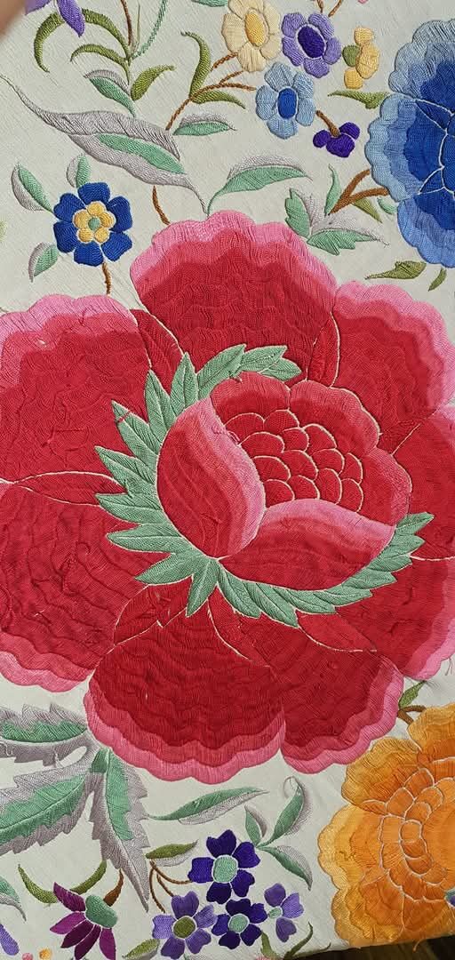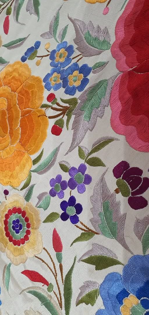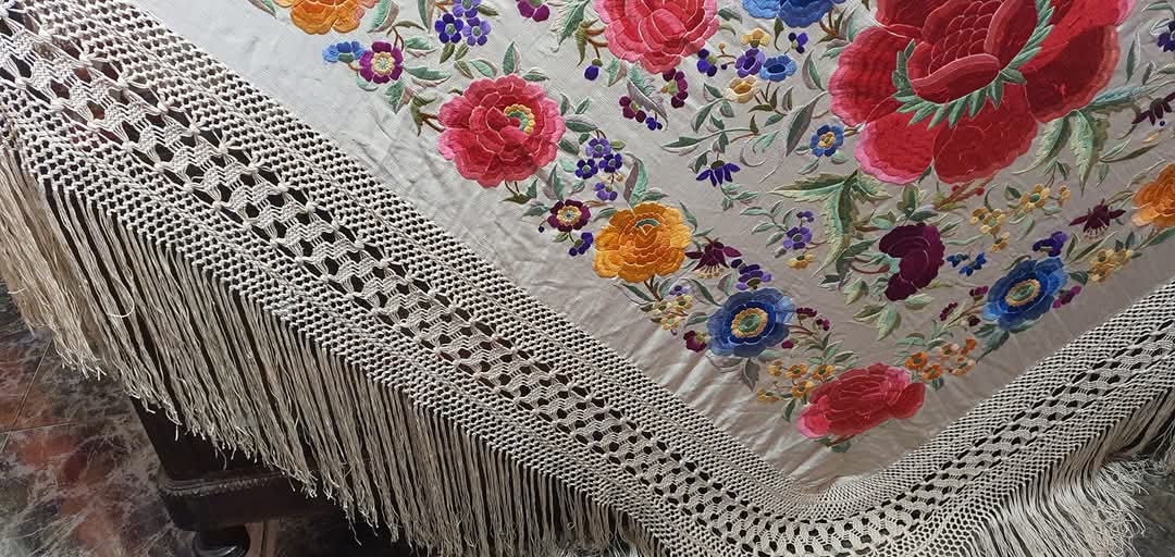 Maravilloso mantón antiguo, seda bordada a mano en 1890. Excelente conservación. Mide 1,60 m de lado más enrejado y fleco