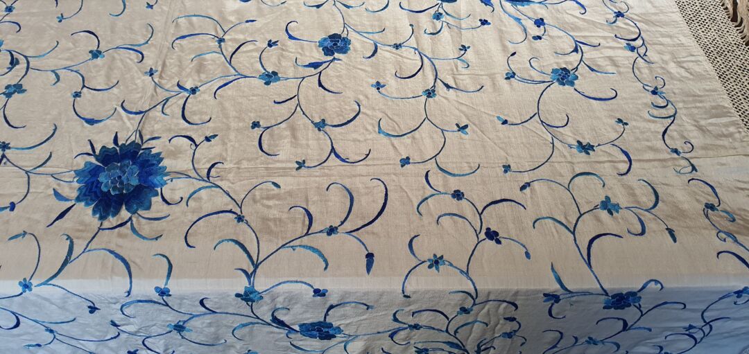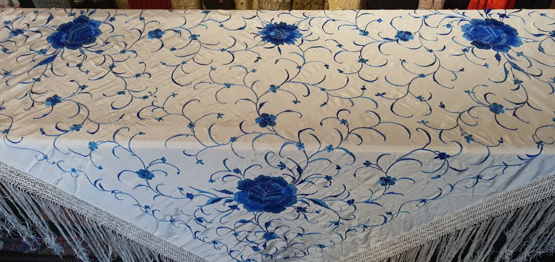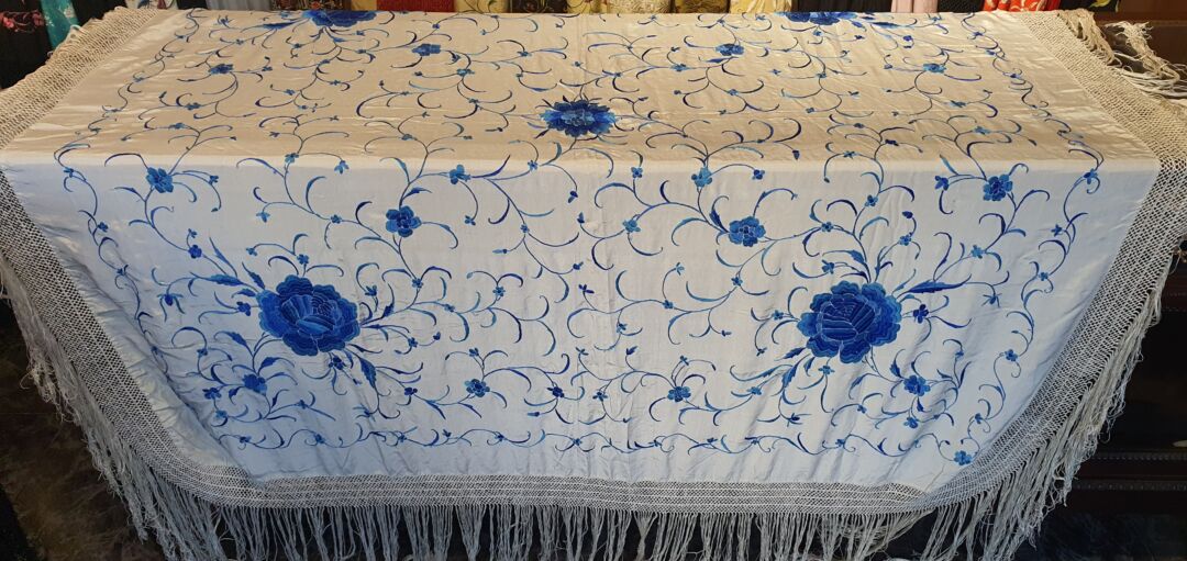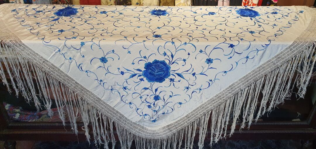 Precioso mantón antiguo, seda bordada a mano en 1890. Impecable. Mide 1,50 m de lado más enrejado y fleco