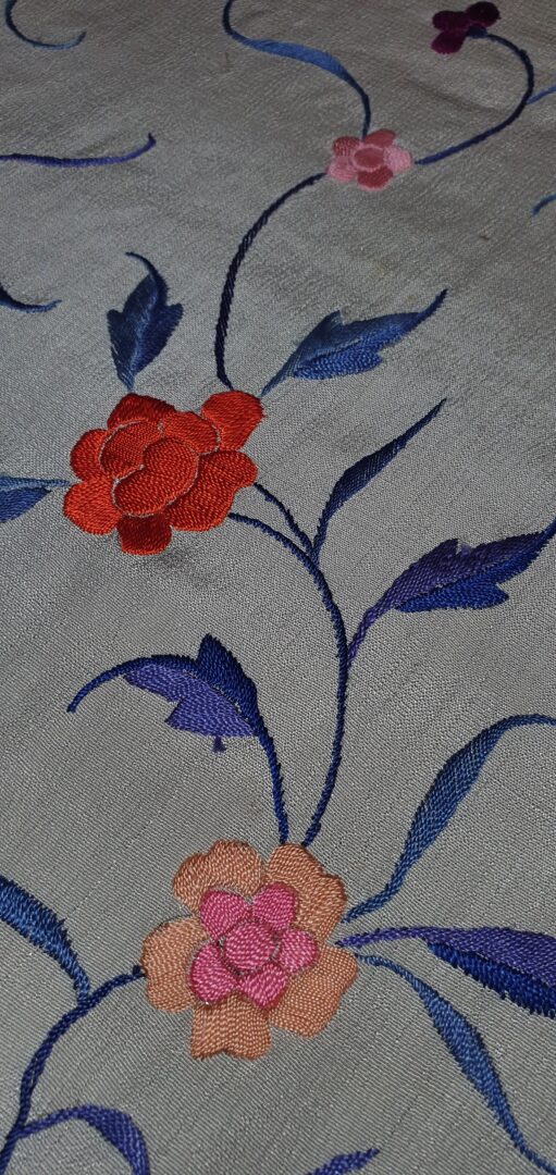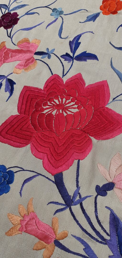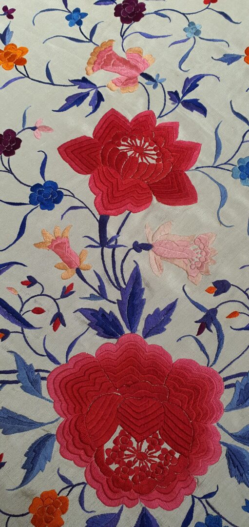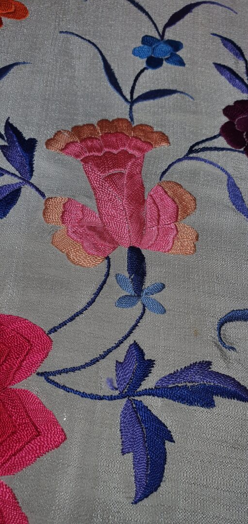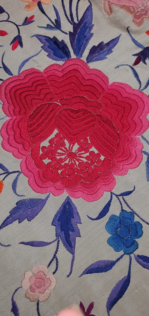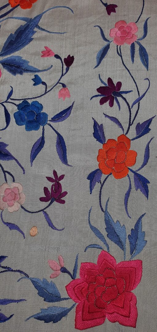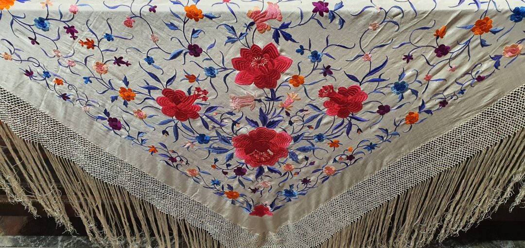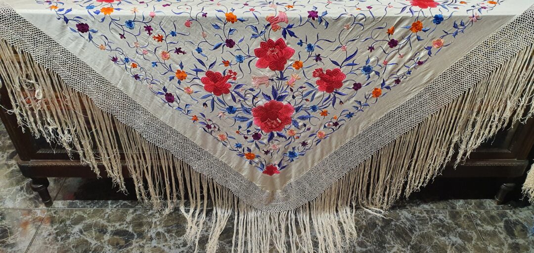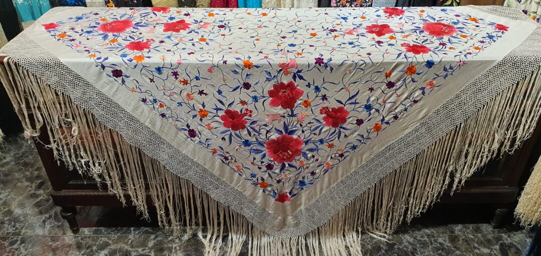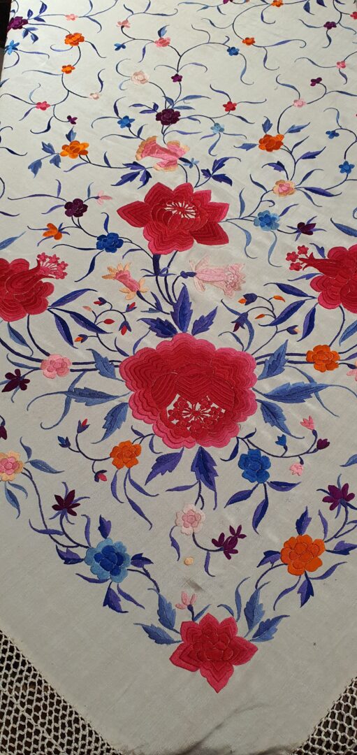 Mantón antiguo, seda bordada a mano en 1890. Un mantón maravilloso, fino, elegante. Una puntada muy precisa. En perfecto estado. Mide 1,60 m de lado más enrejado y fleco