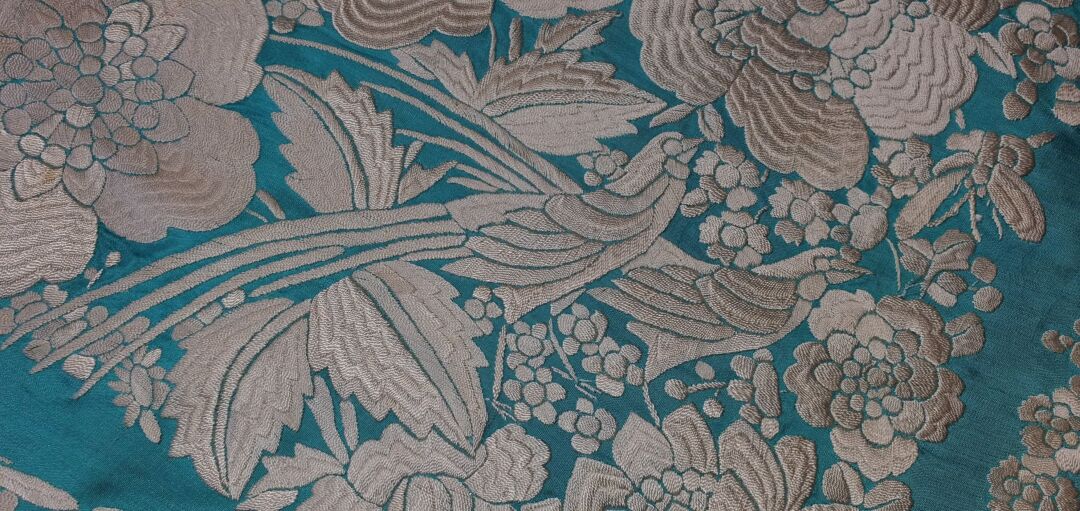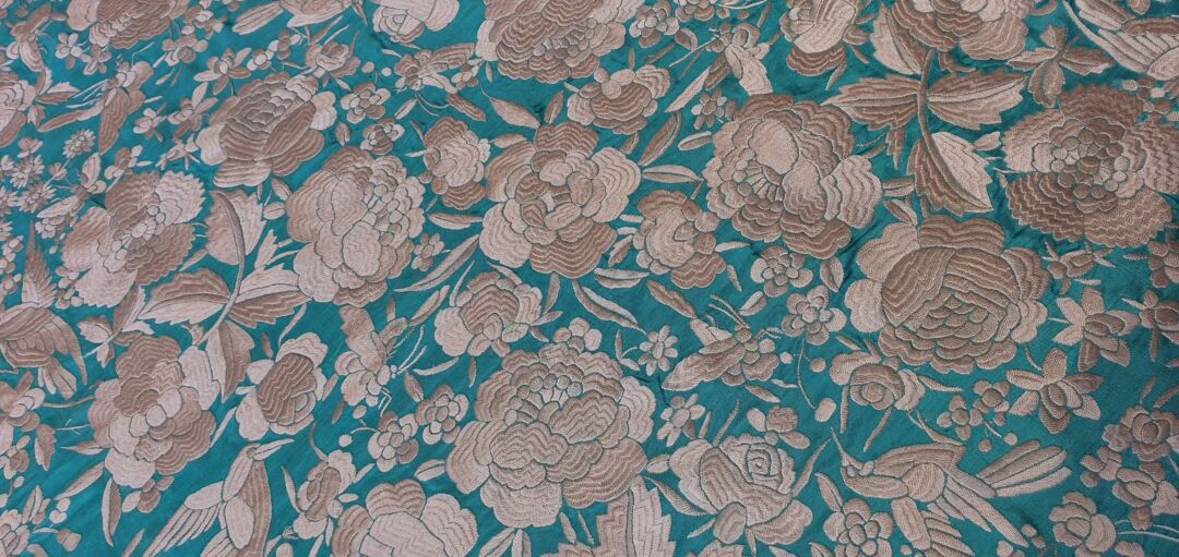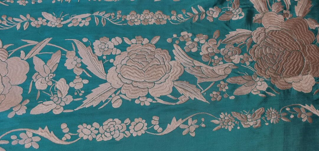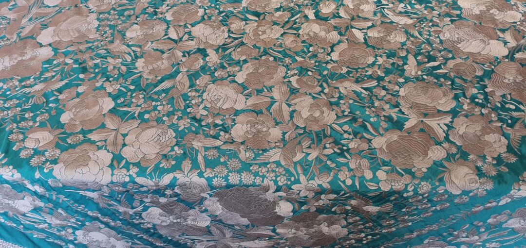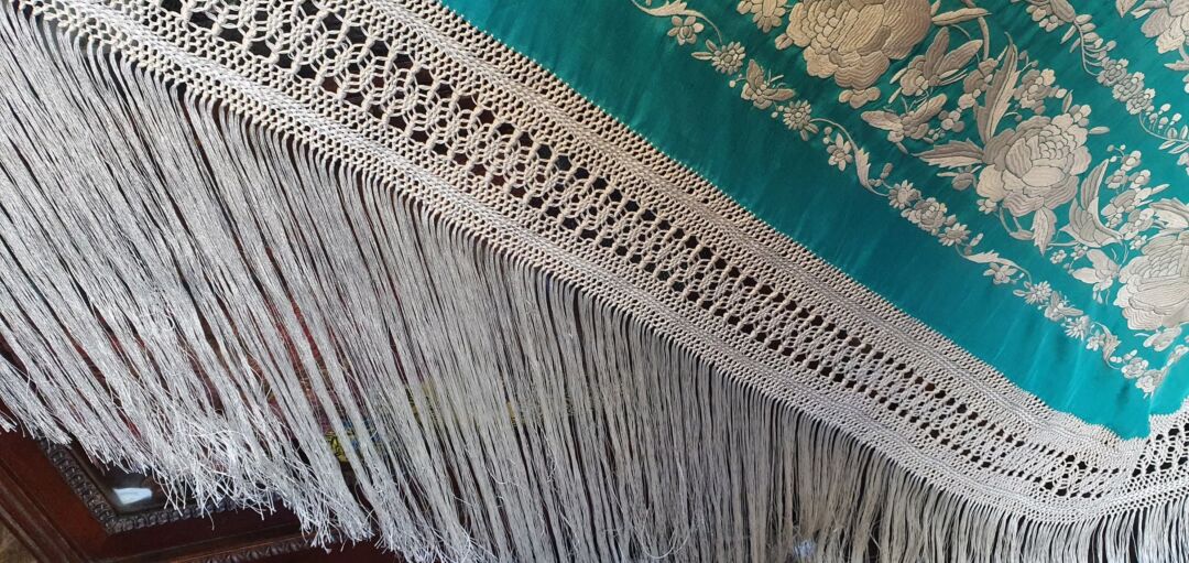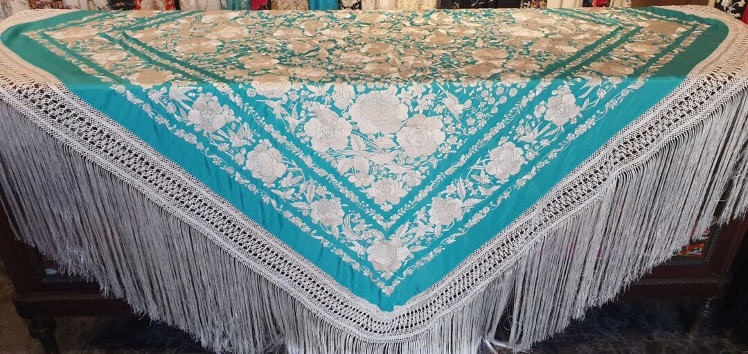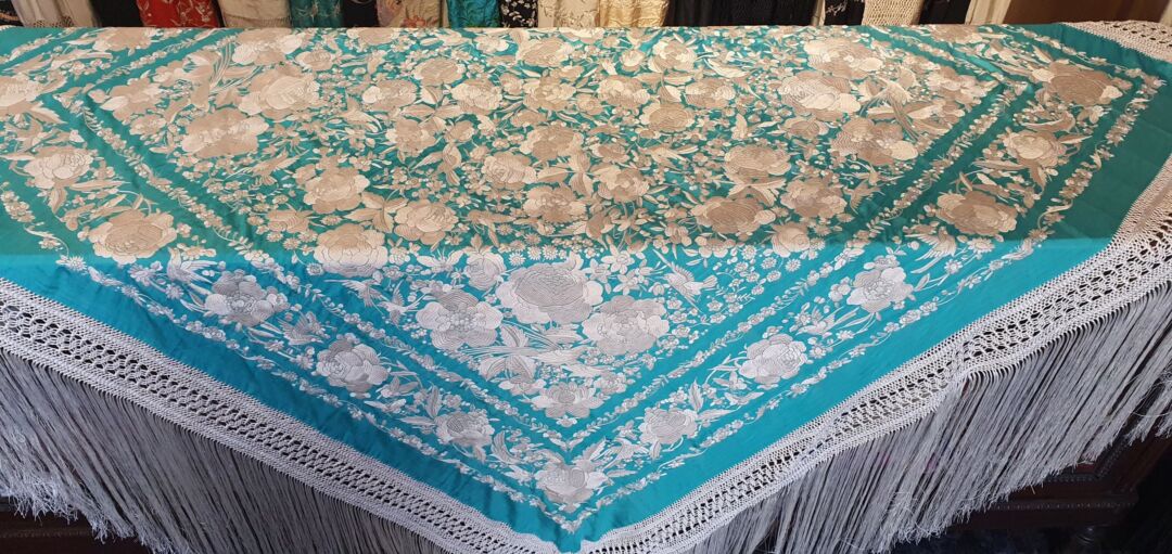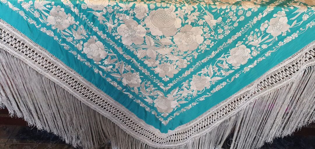Mantón que llegó a mis manos sin flecar, sin uso, tal cual fue bordado en 1920… de tres cenefas. Flecado ahora en Cantillana. Con una puntada muy minuciosa y prieta propia de las mejores bordadoras, estado de conservación inmejorable. Fondo verde agua bordado en blanco.
