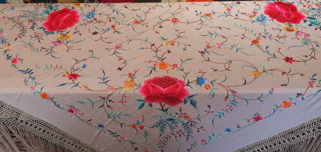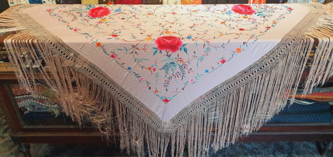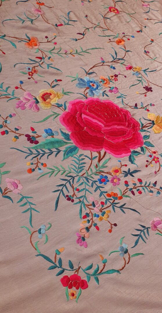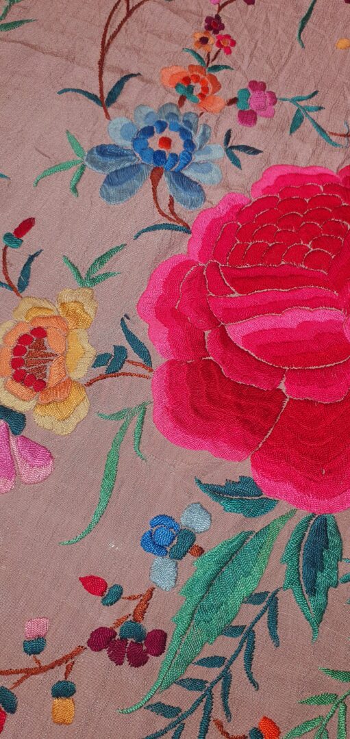 Mantón de seda bordada a mano en 1920, lila muy clarito tirando a rosado… precioso! Mide 1,30 m de lado más enrejado y fleco