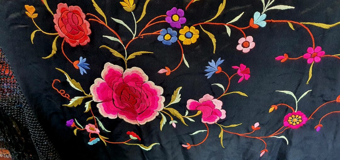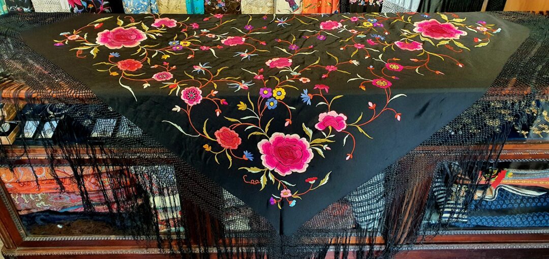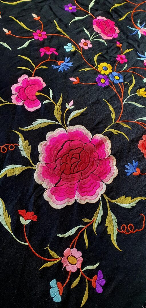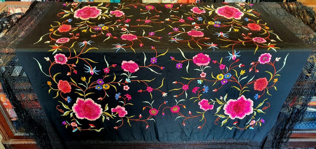 Un mantón mediano, manejable, no pesa nada y con un colorido muy alegre. Seda bordada a mano en 1920. Mide 1,25 m de lado más enrejado y fleco. Perfecto estado de conservación.