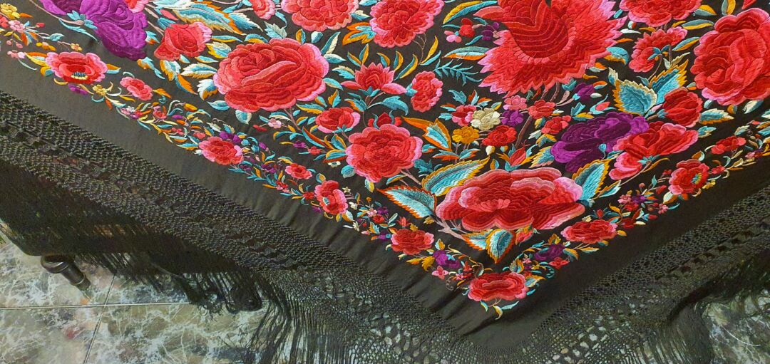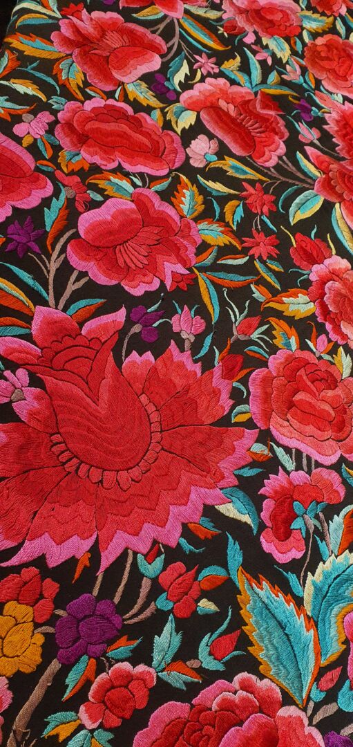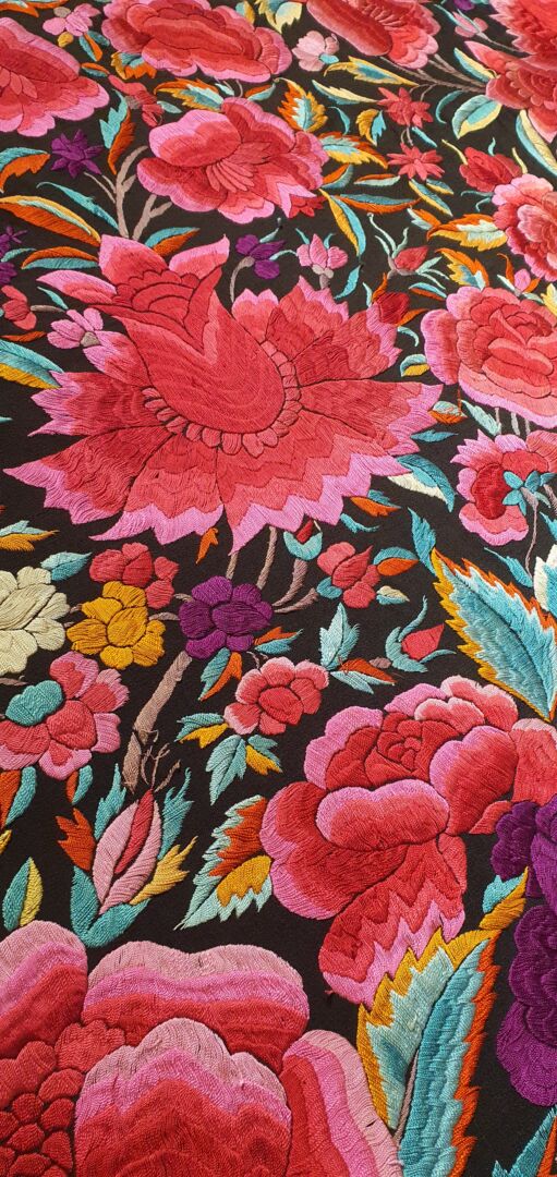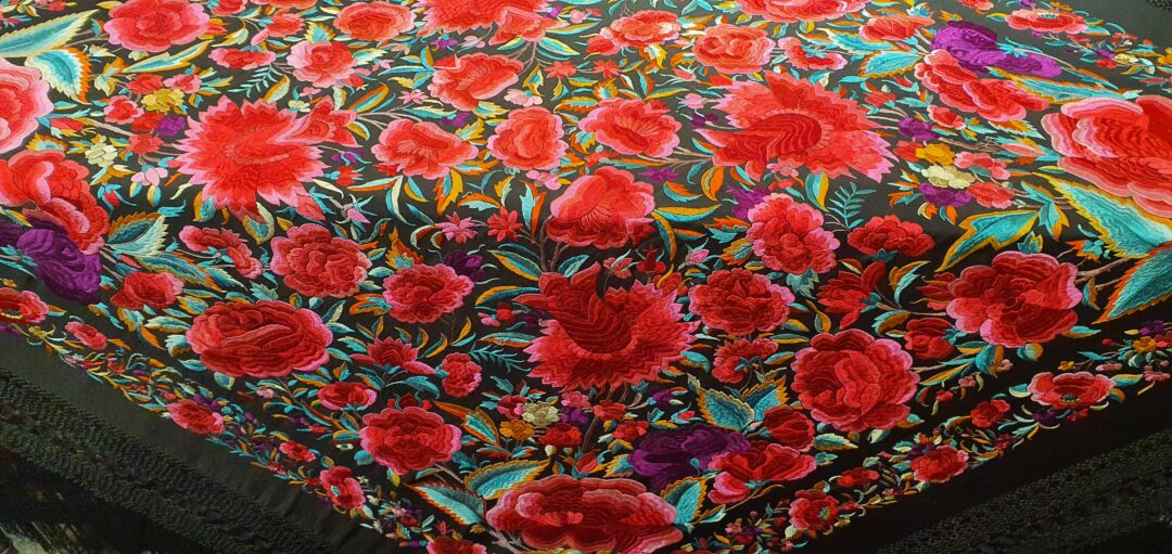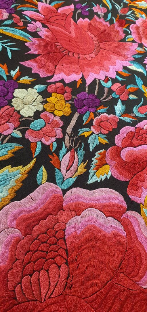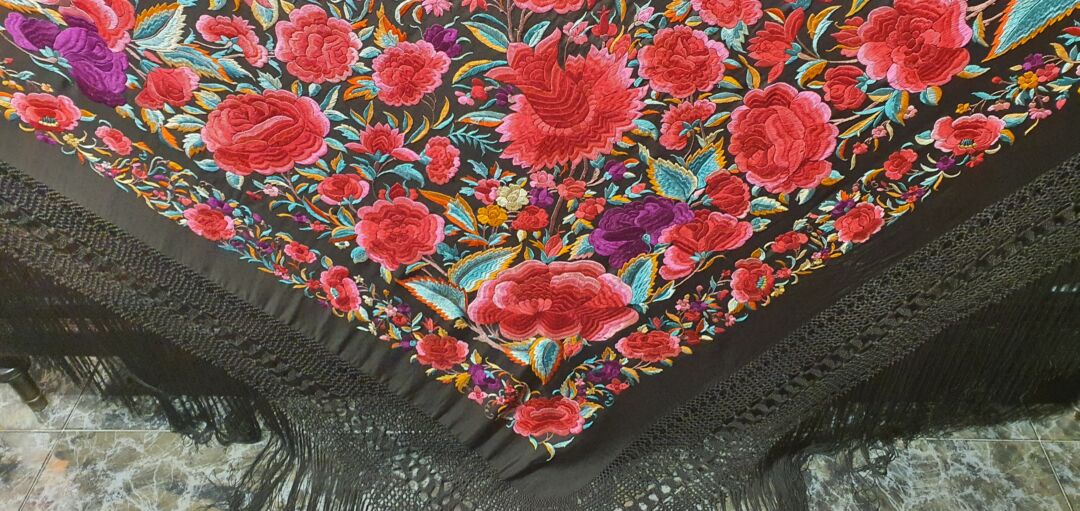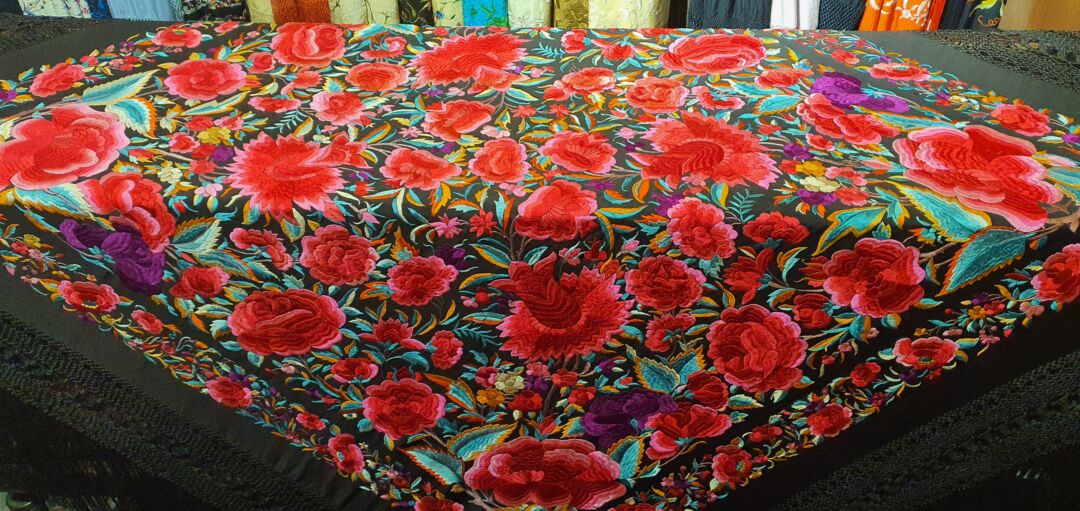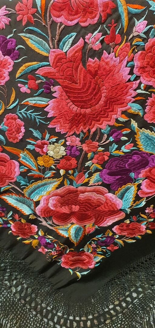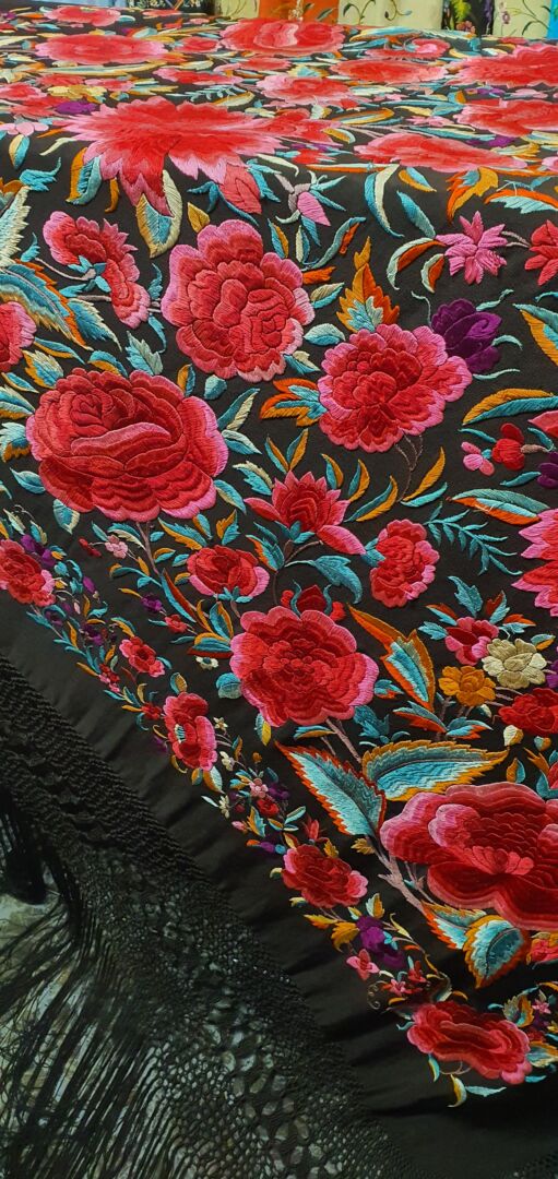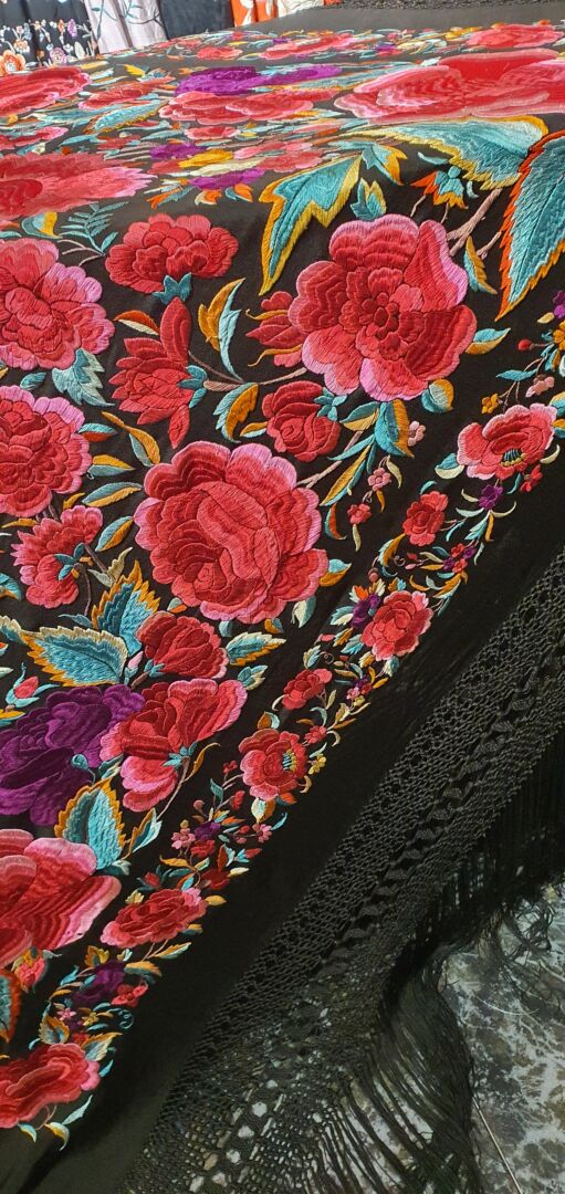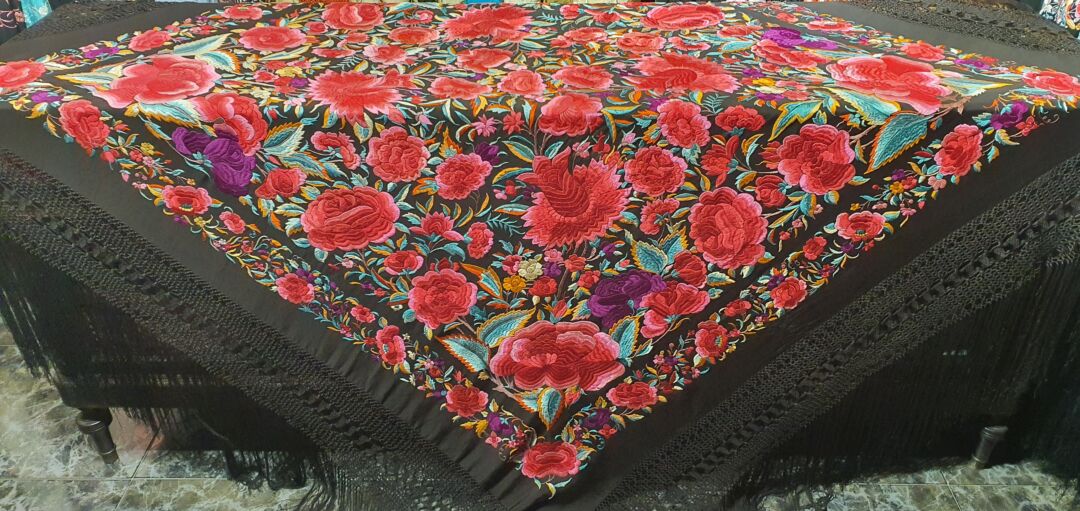 Extraordinario mantón antiguo ala de mosca de tulipán. De colección. Fondo marrón muy oscuro. Mide 1,60 m de lado más enrejado y fleco.