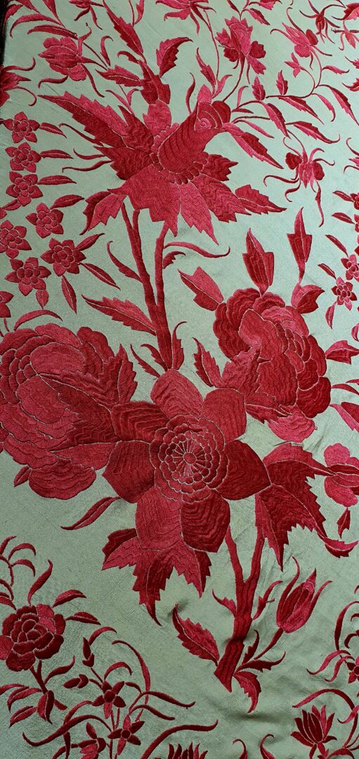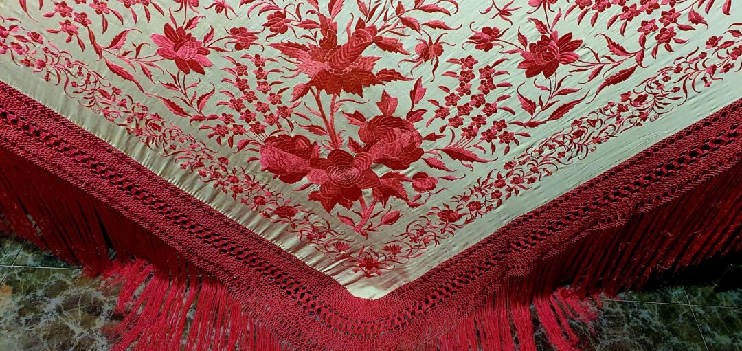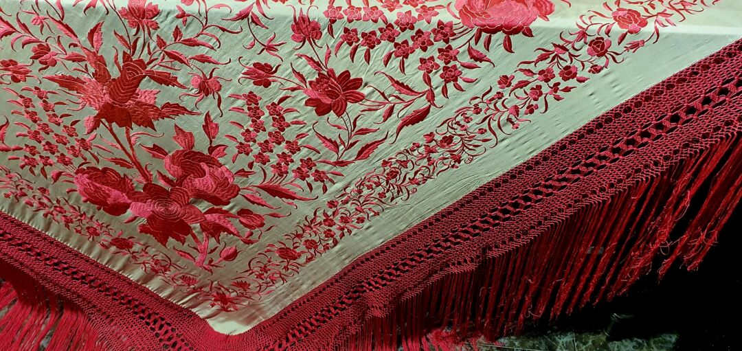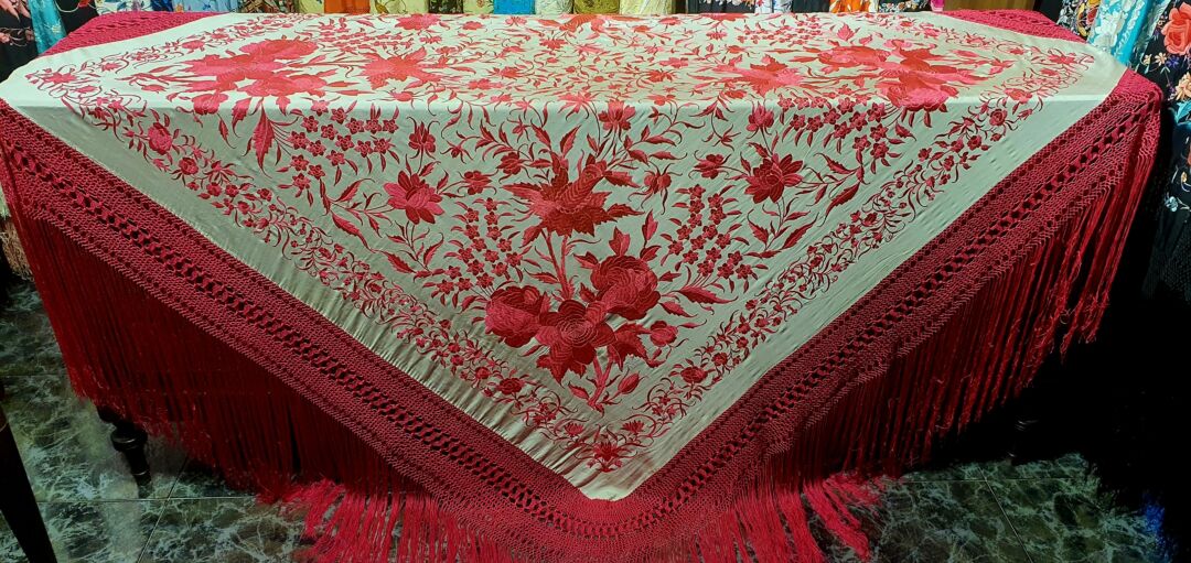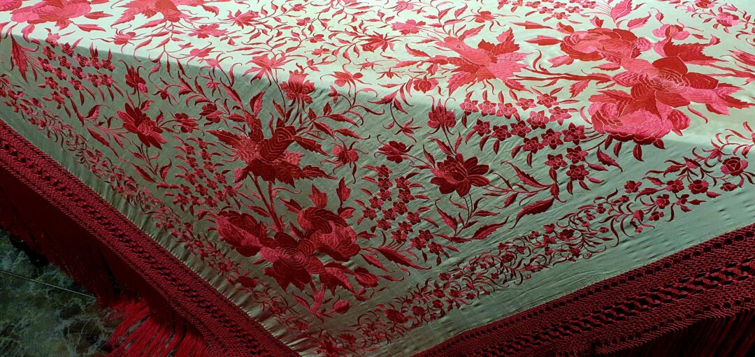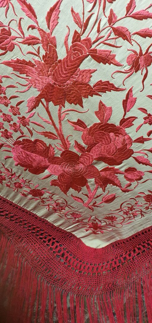 Mantón antiguo de tulipán, seda bordada a mano en 1890. Fondo beige bordado en tosa fucsia. Mide 1,60 m de lado más enrejado y fleco. Excelente conservación.