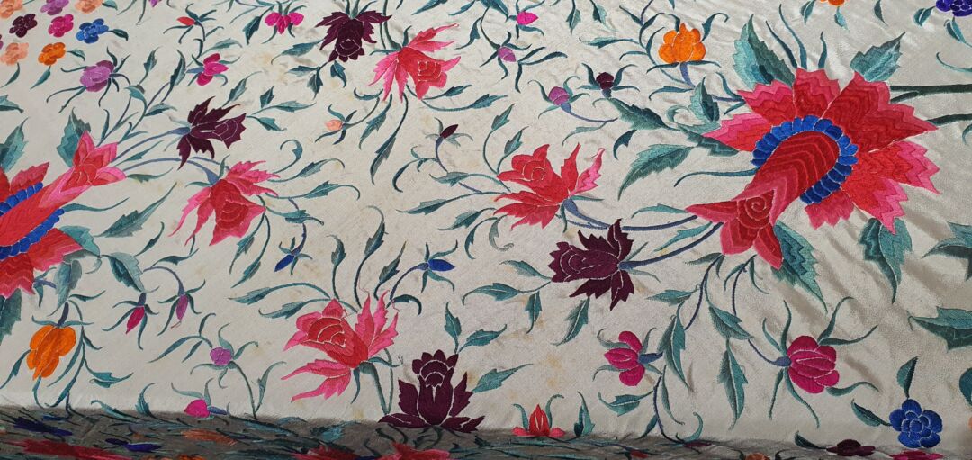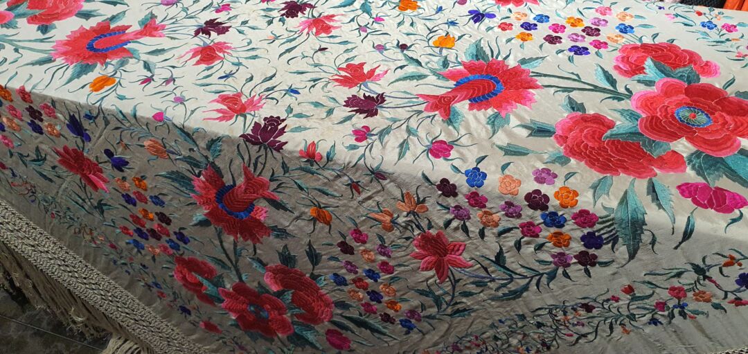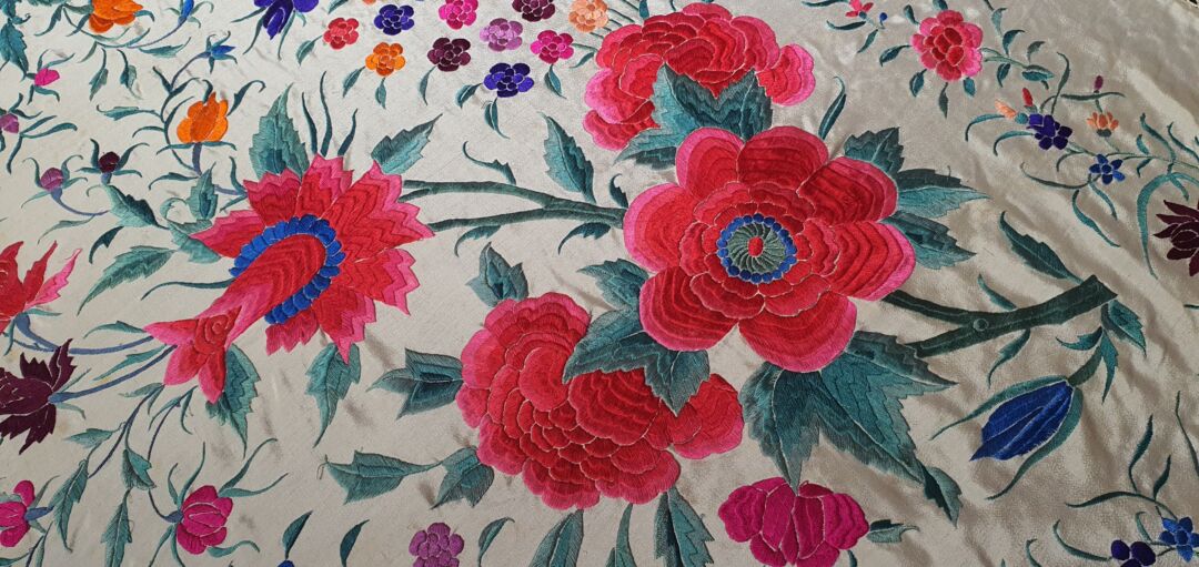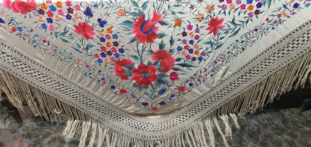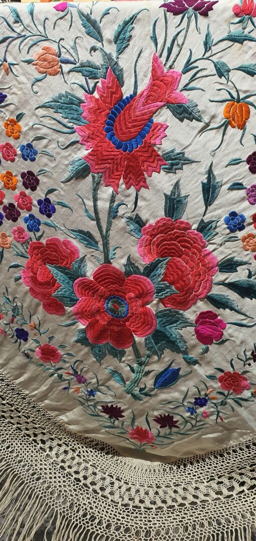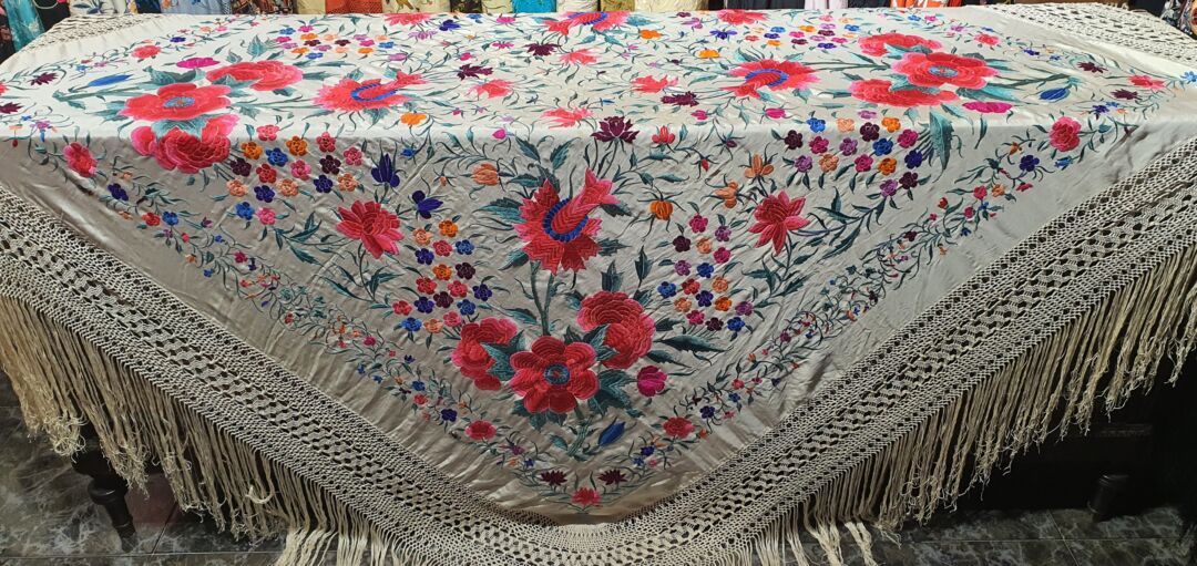 Mantón antiguo de tulipán, seda bordada a mano en 1890. Fondo beige. Mide 1,60 m de lado más enrejado y fleco. Alguna manchita lógica del paso del tiempo.