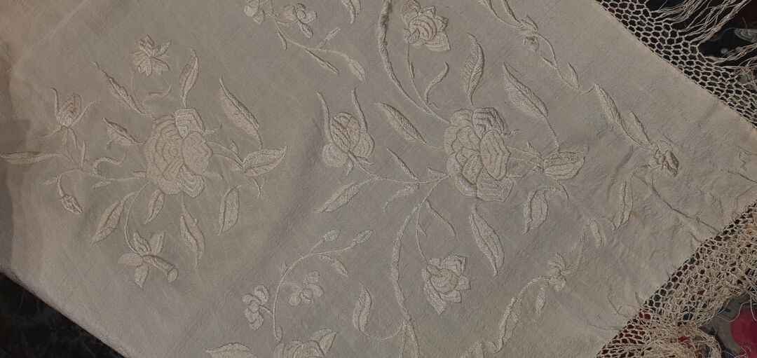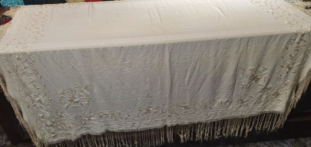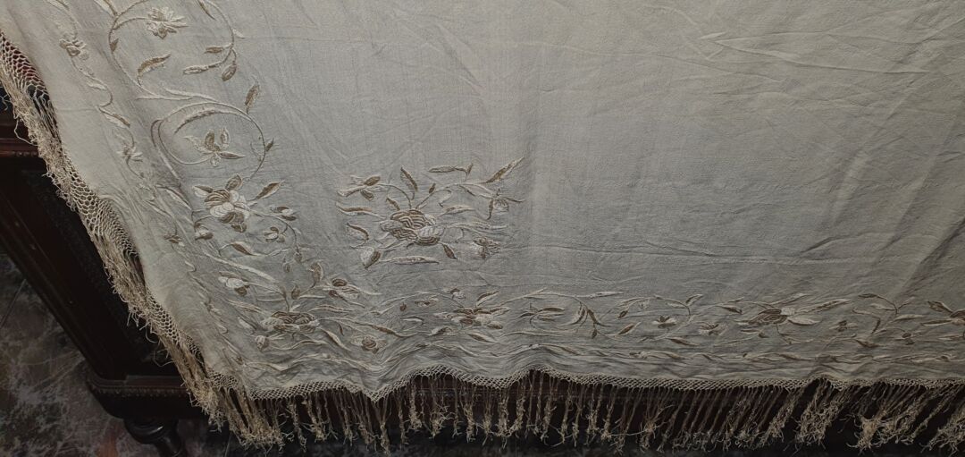 Mantón antiguo imperio de cuarterones, seda bordada a mano en 1810