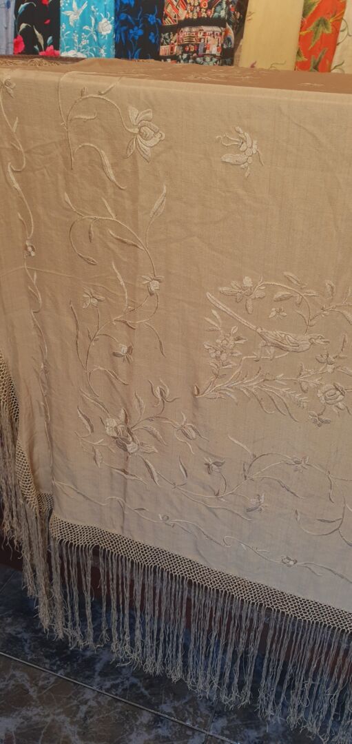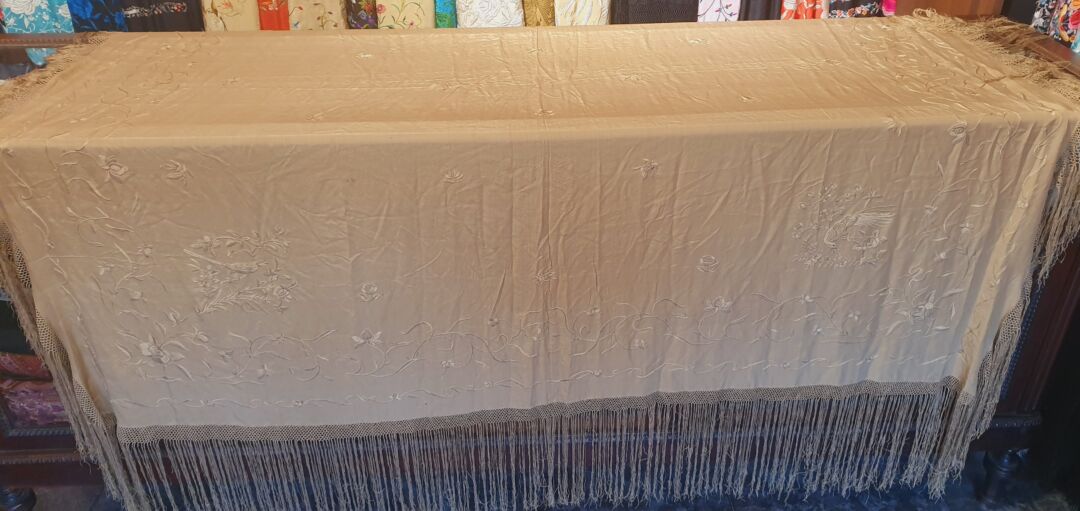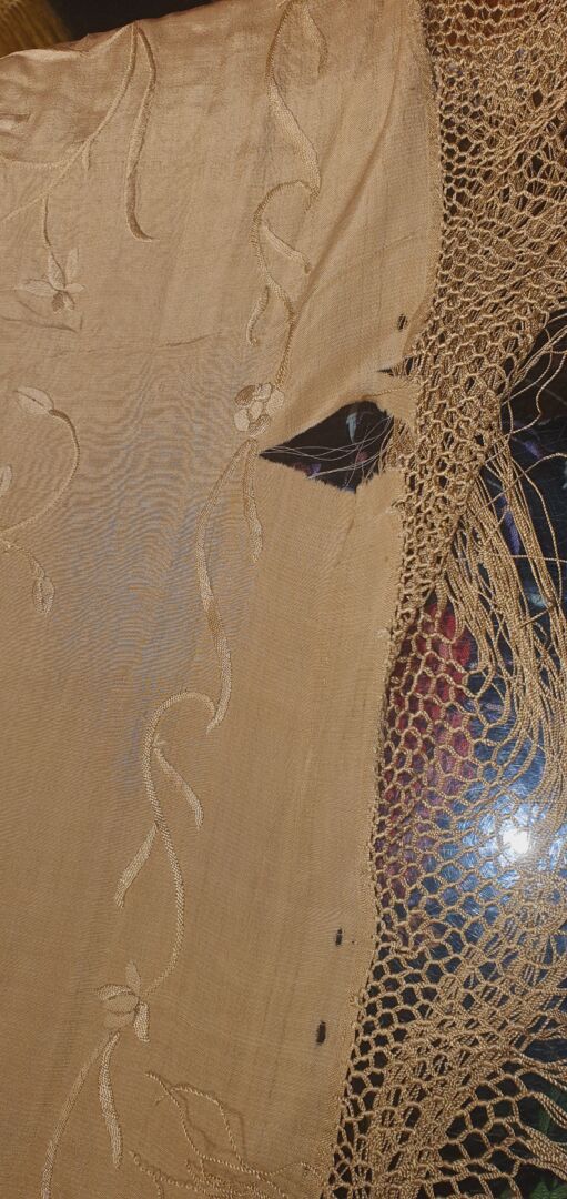 Mantón antiguo imperio de cuarterones, seda bordada a mano en 1820, para restaurar un roto. Color verdoso. Mide 1,60 m de lado más enrejado y fleco
