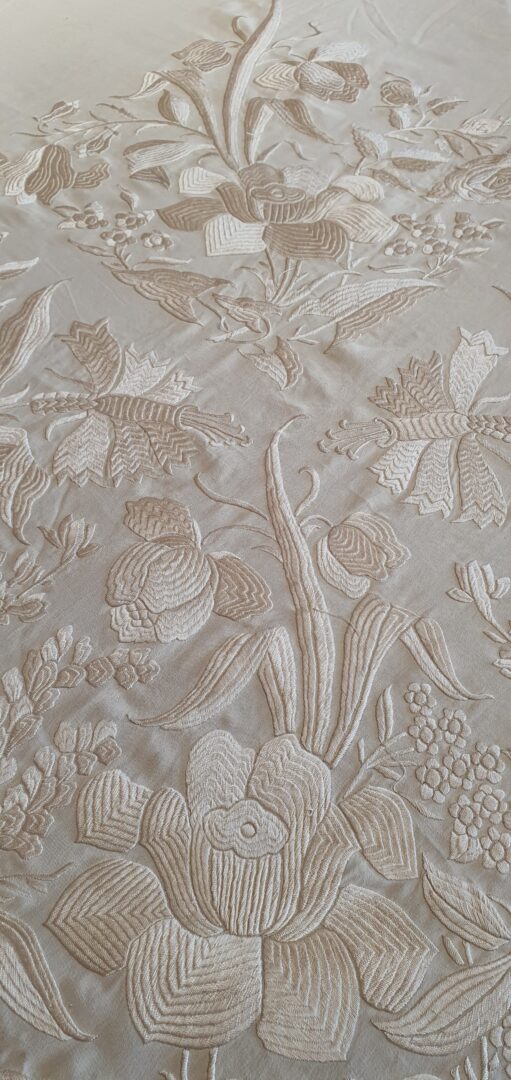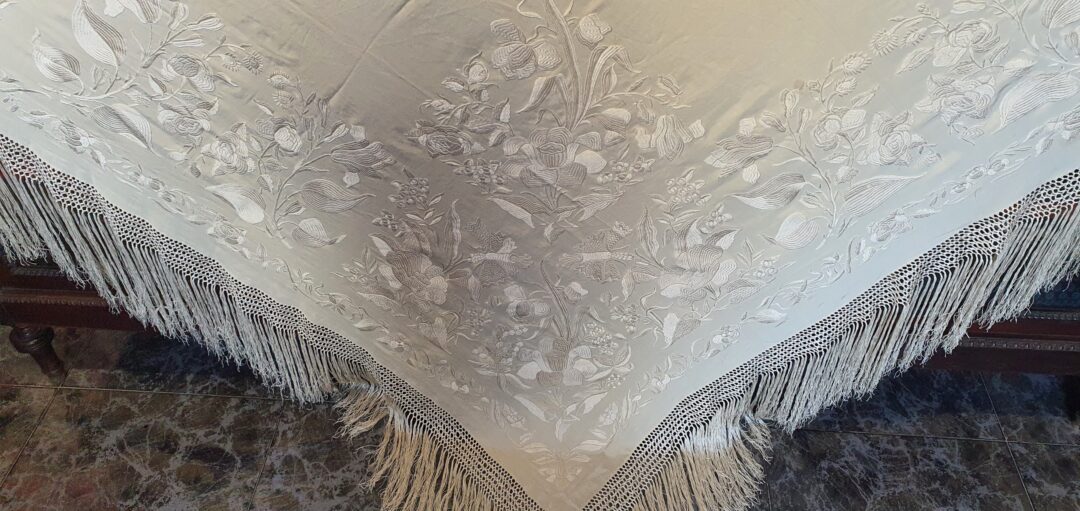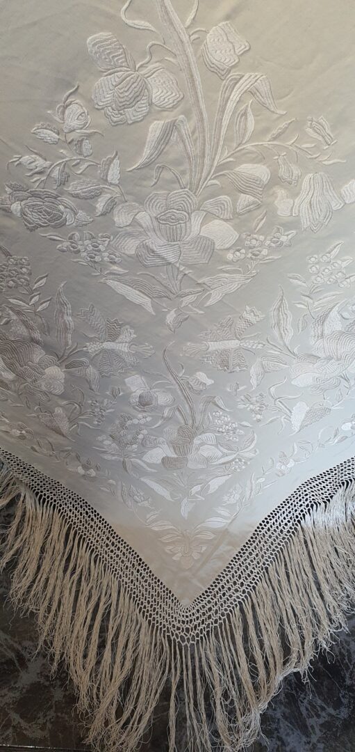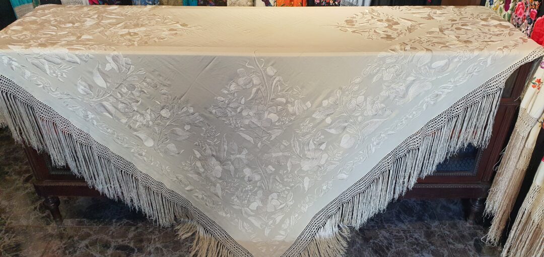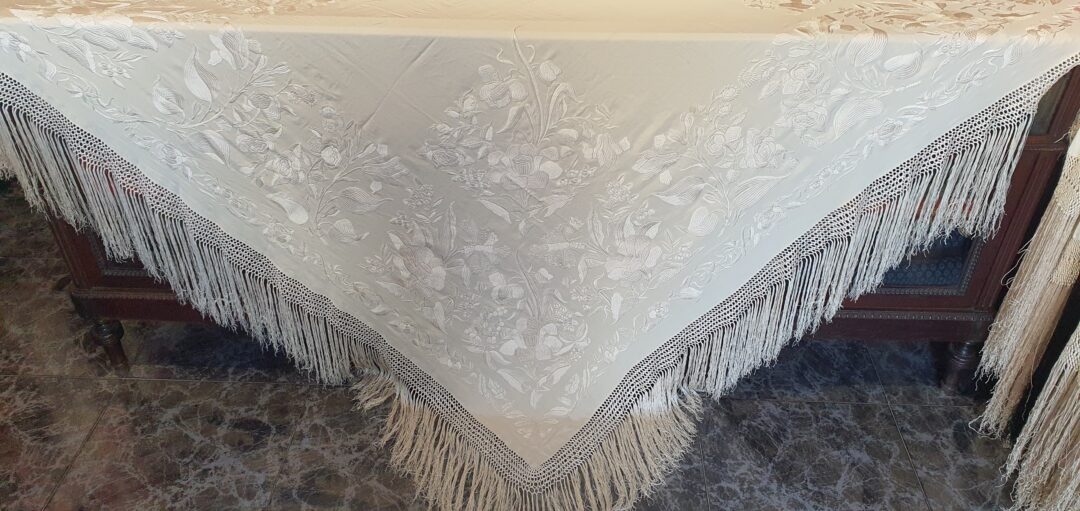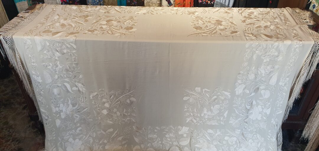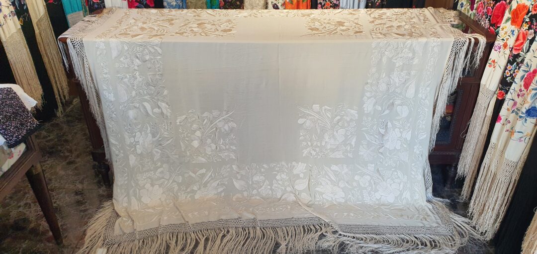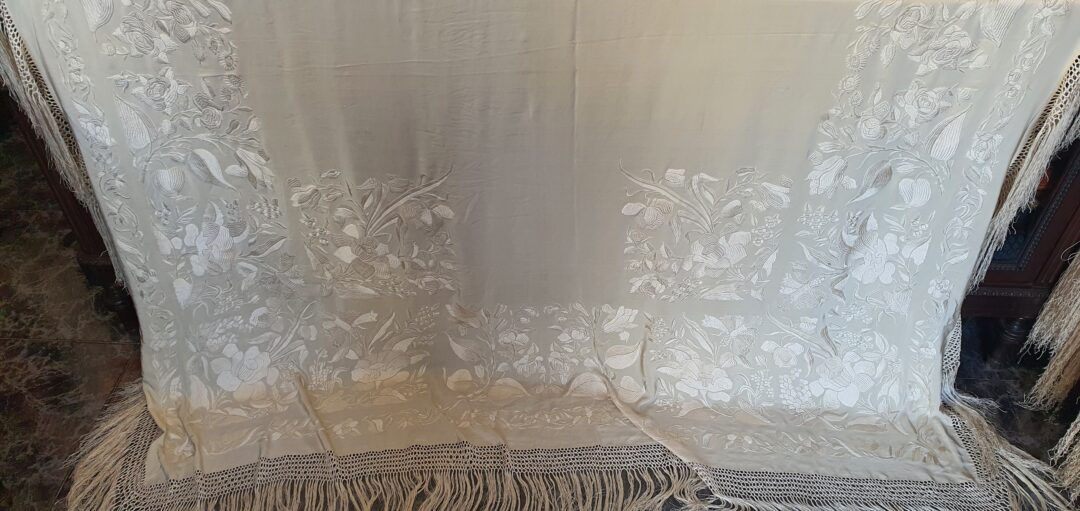 Imperio de cuarterones, año 1820. Seda bordada a mano. Excelente estado de conservación. Muy grande, mide 1,72 m de lado más enrejado y fleco. Puntada minuciosa, corta, prieta. Sin duda un mantón para quitarse el sombrero