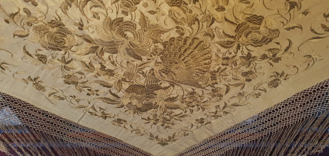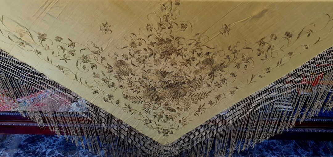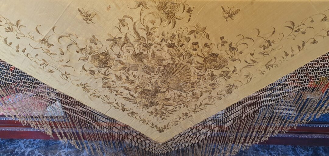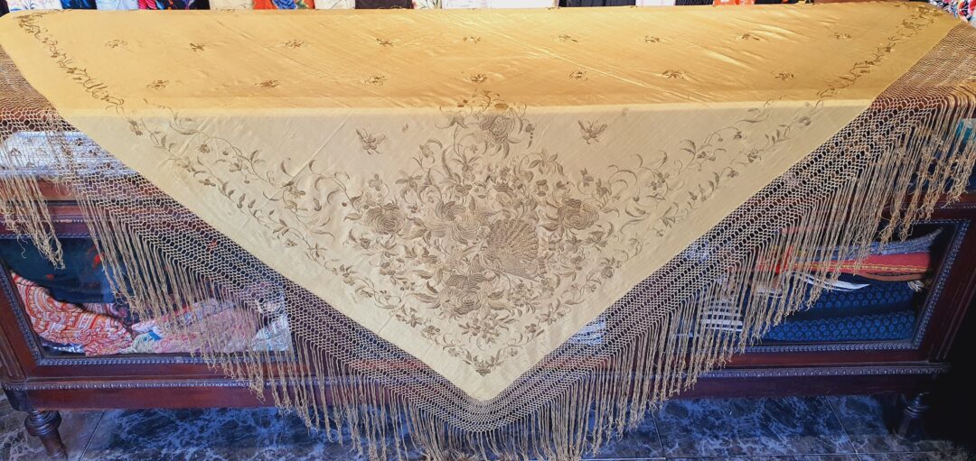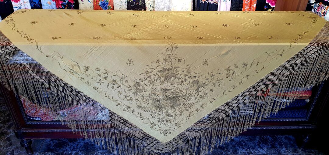 Mantón antiguo isabelino, seda bordada a mano en 1840. Dos esquinas distintas. Color verde aceite. Mide 1,60 m de lado más enrejado y fleco