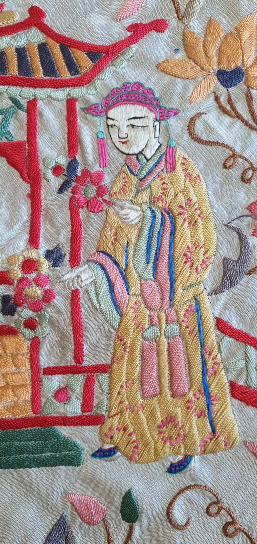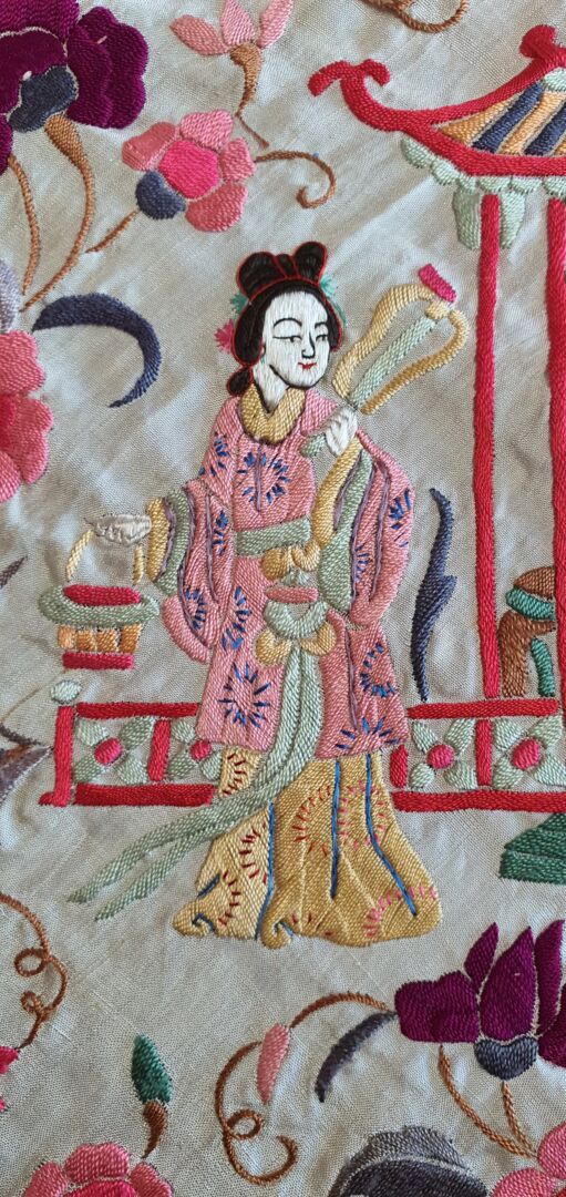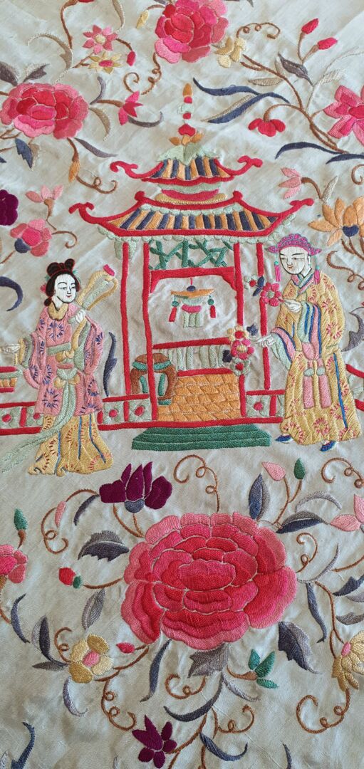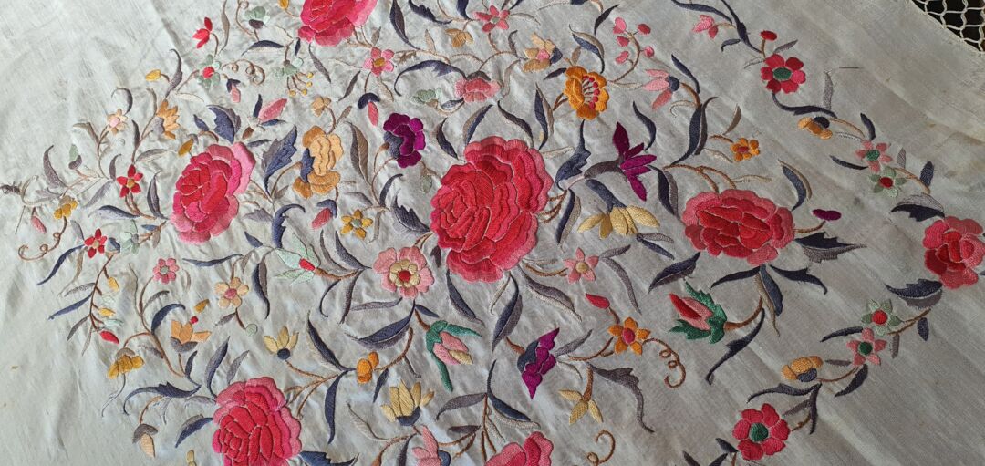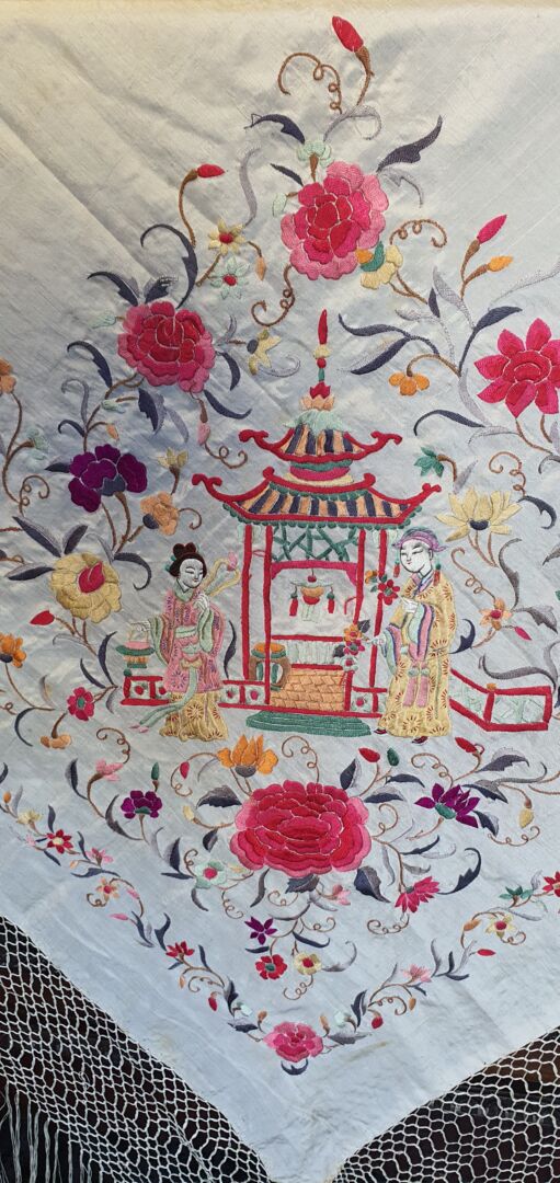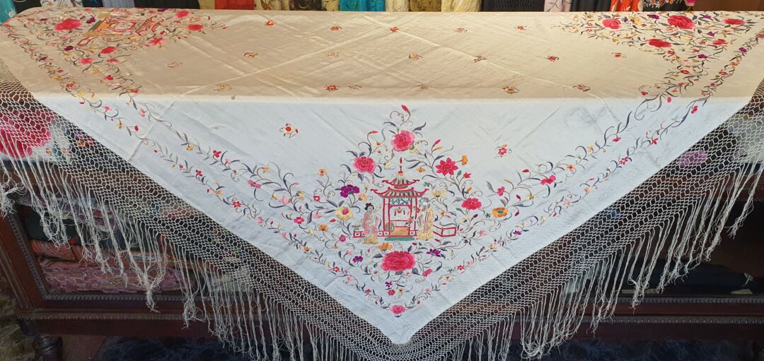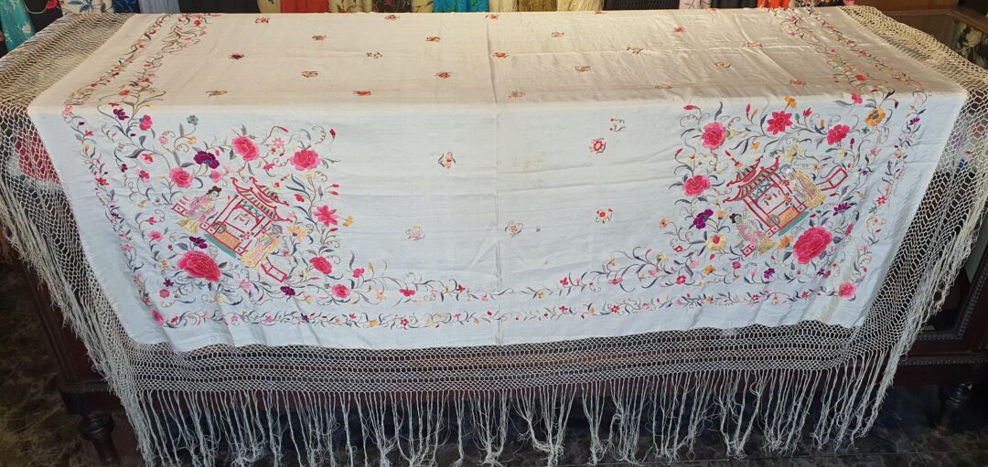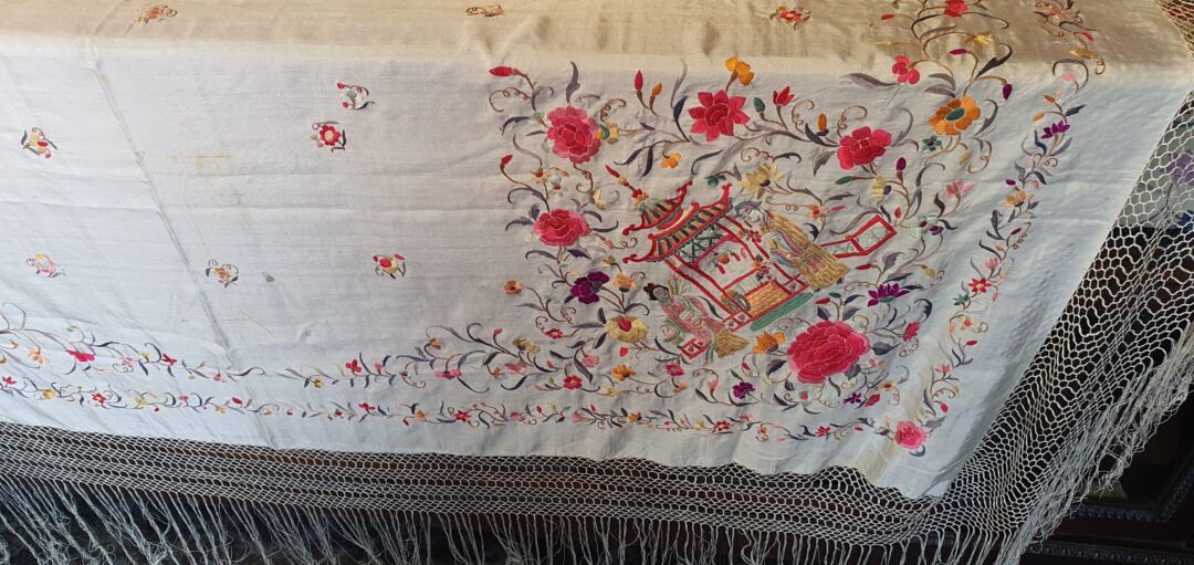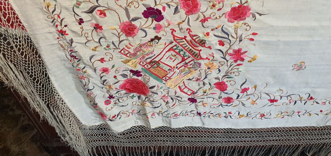 Mantón antiguo isabelino, seda bordada a mano en 1860. Dos esquinas chinescas con escena de cortejo en pagoda y dos florales.
