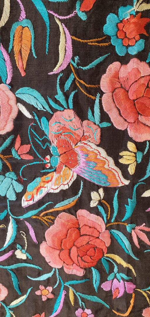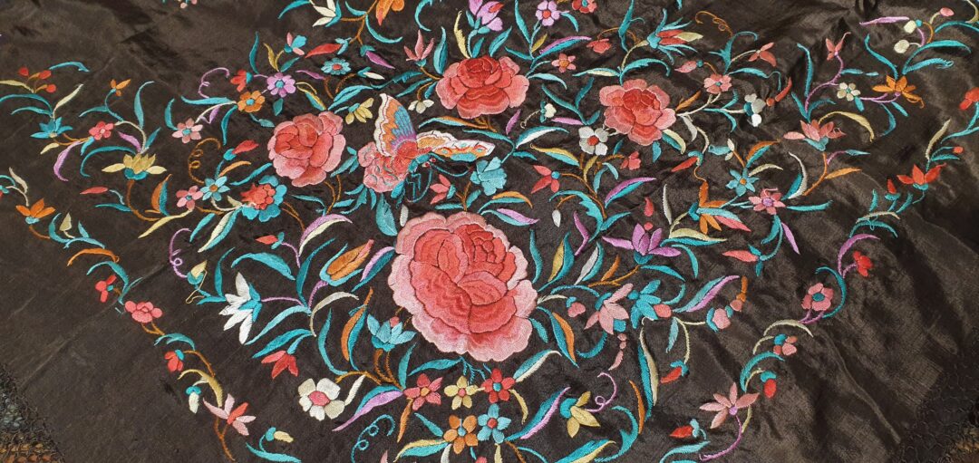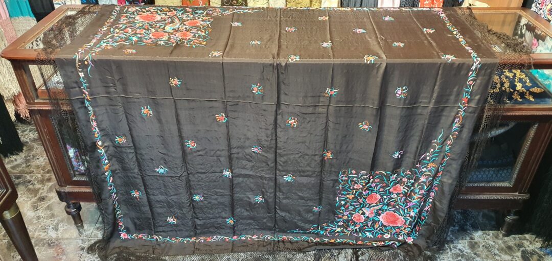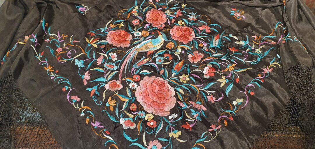 Mantón antiguo isabelino de los llamados ala de mosca. Seda bordada a mano en 1840. De los primeros ala de mosca.