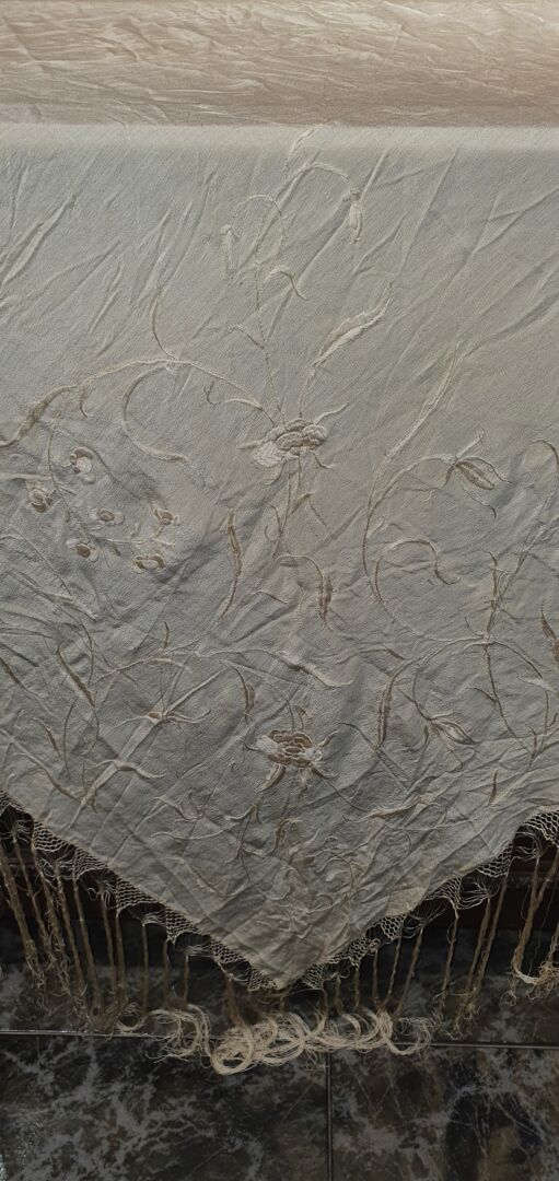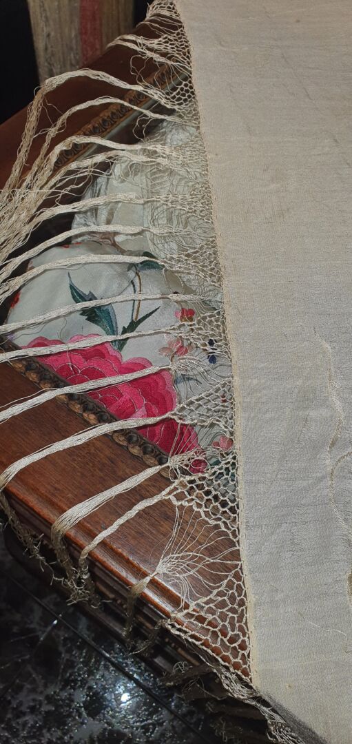Maravilloso mantón antiguo isabelino beige, dos esquinas bordadas, fleco magnífico de espiga. Mide 1,60 m de lado más enrejado y fleco. Seda bordada a mano en 1820