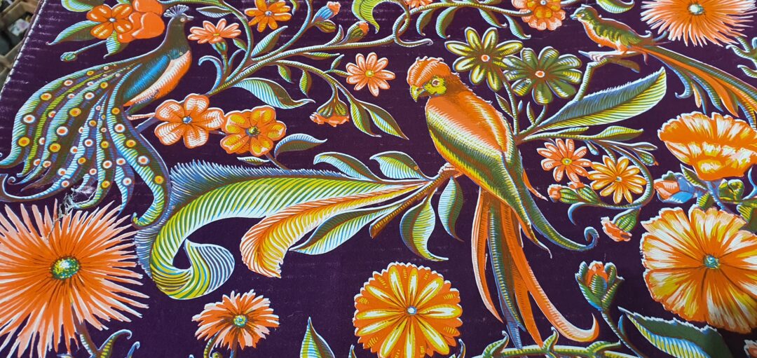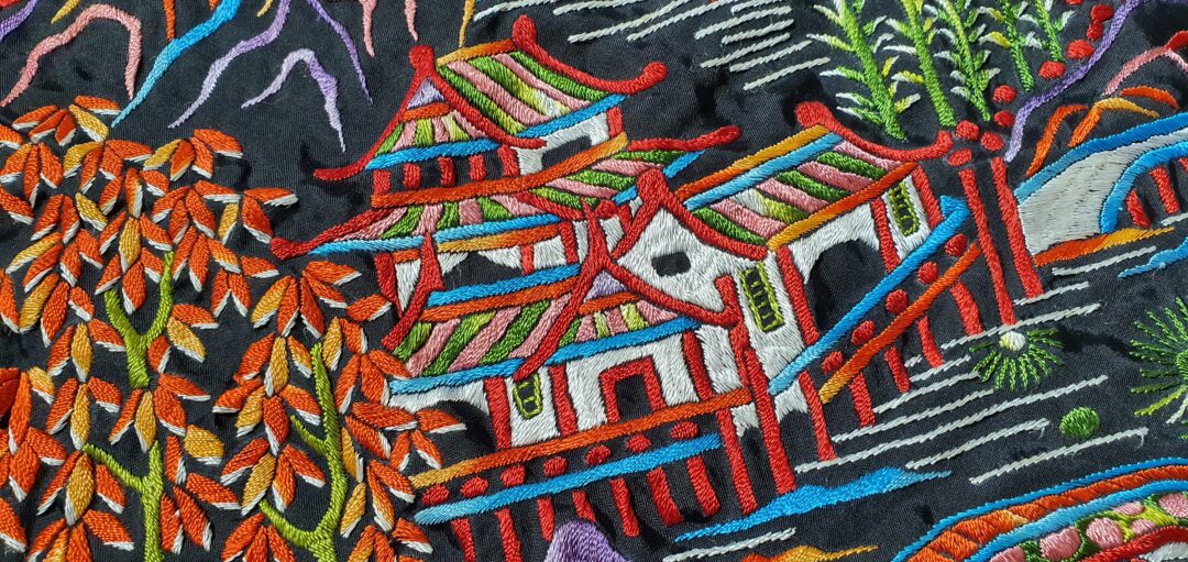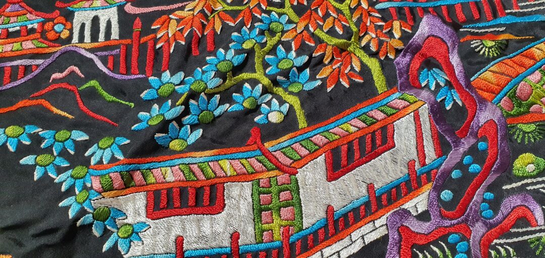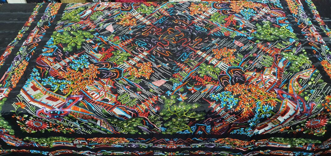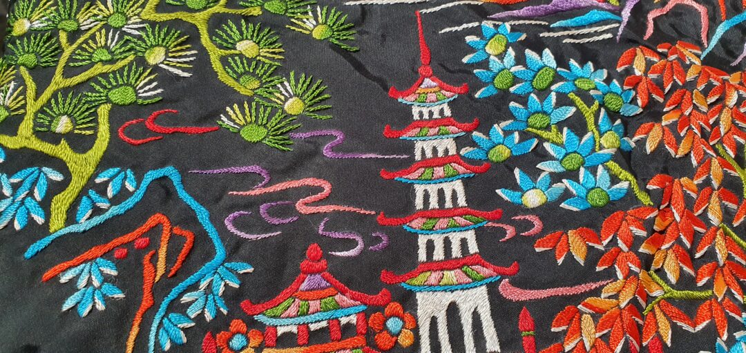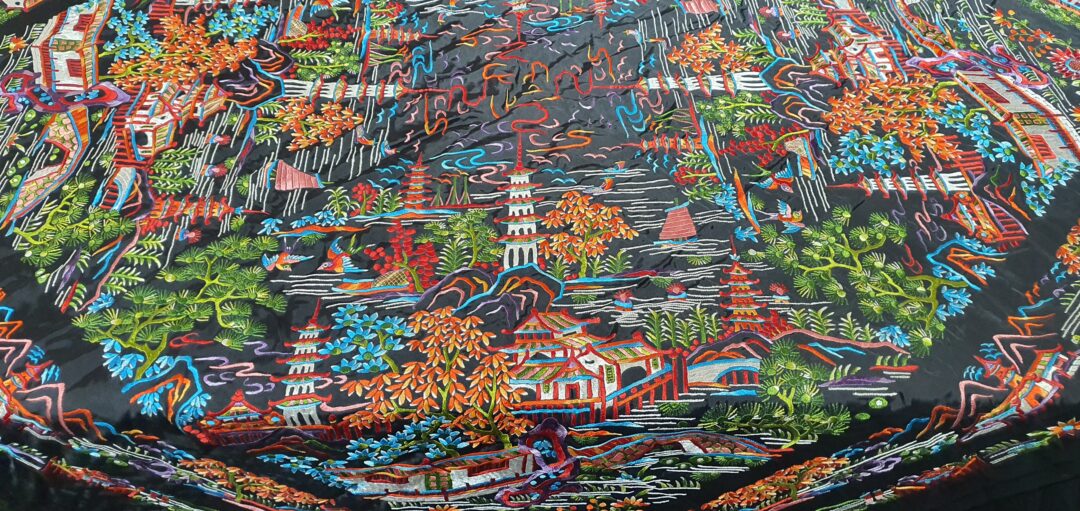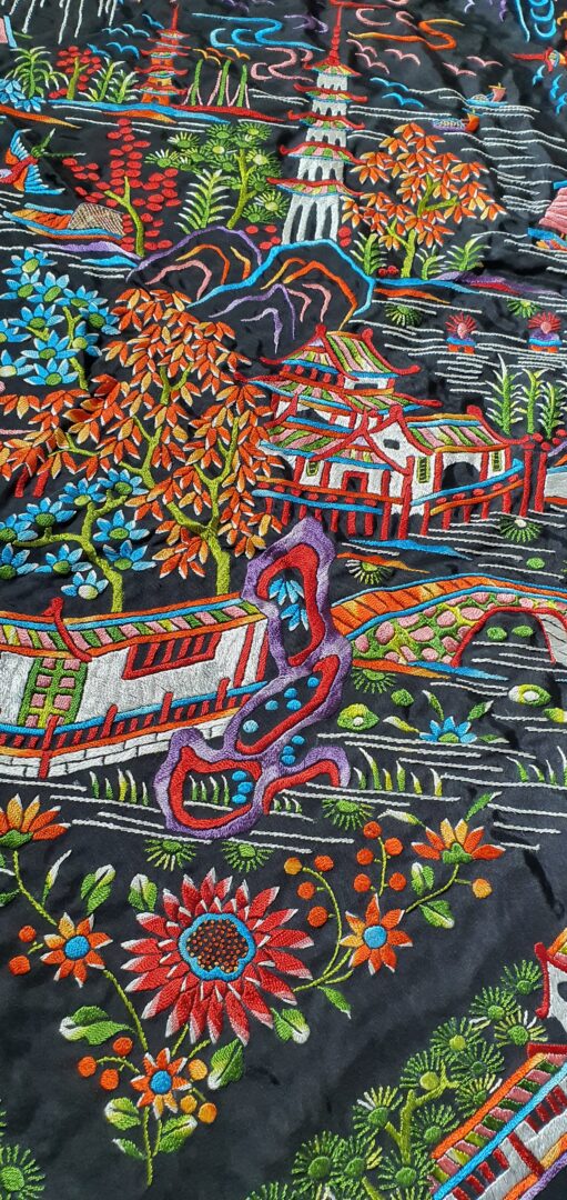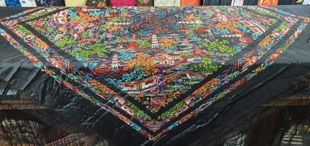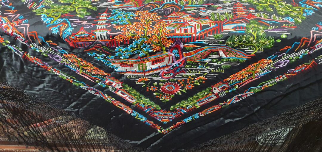 Precioso mantón estilo cantonés bordado a mano en raso en los años 70