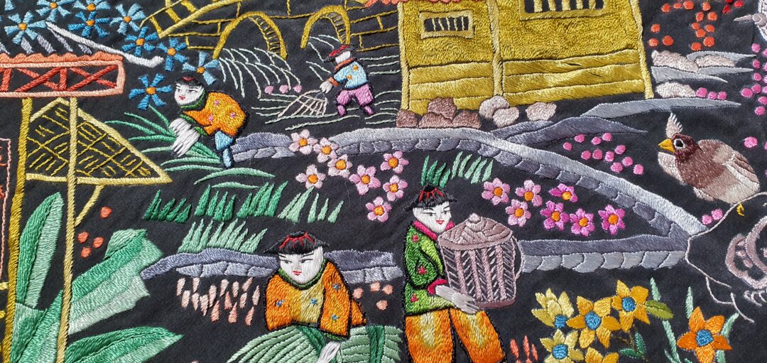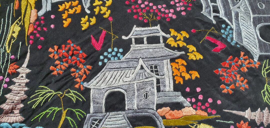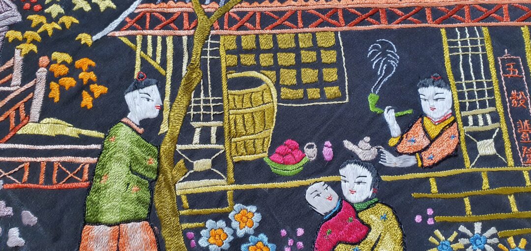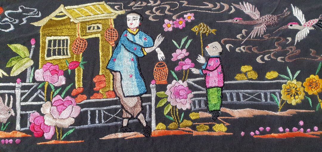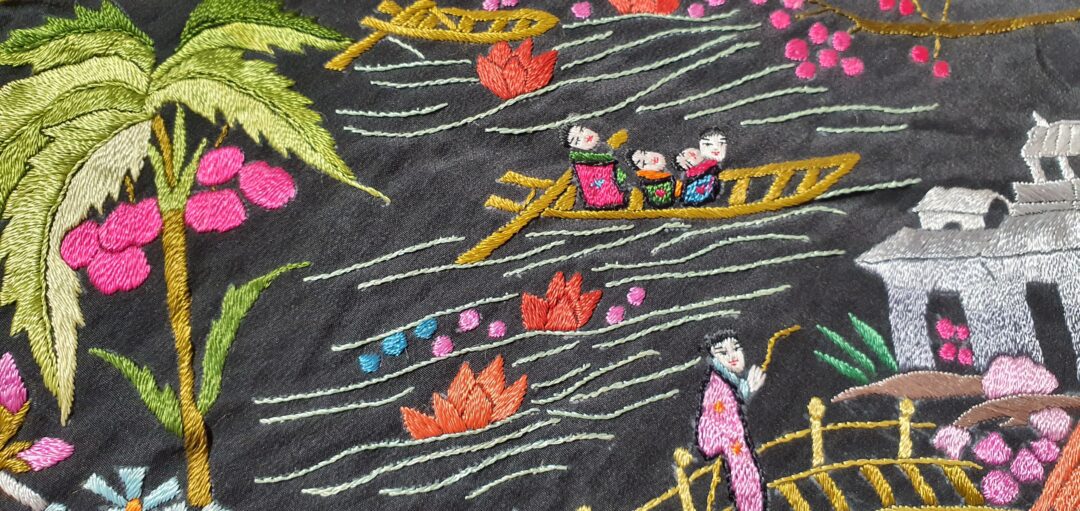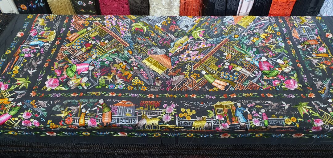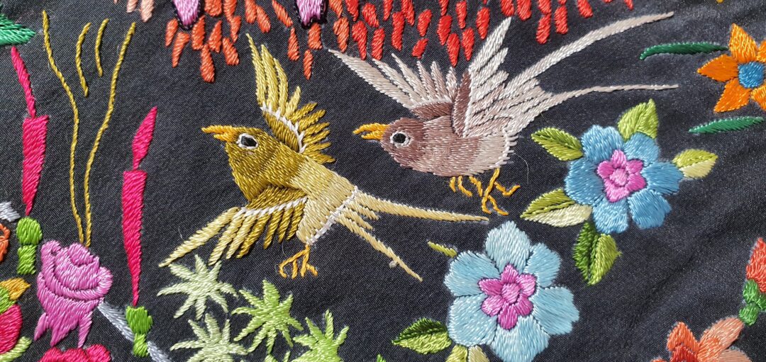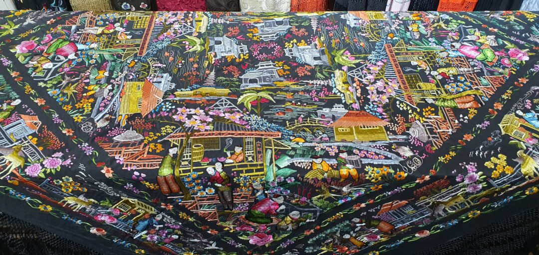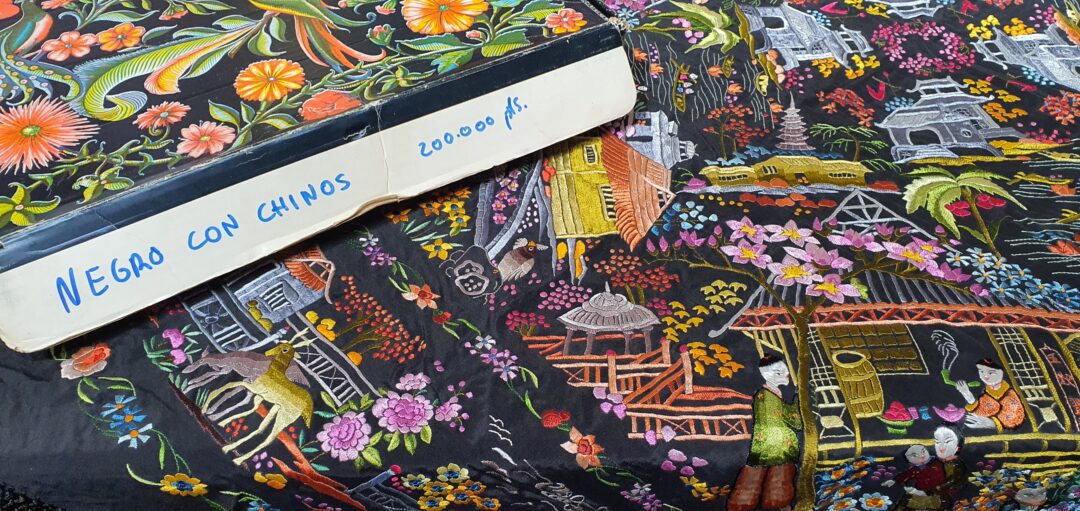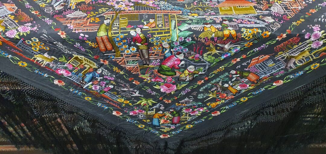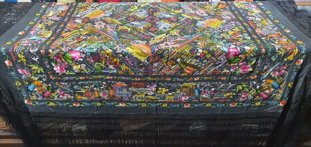 Excelente mantón de bordado manual cantonés en seda. Mide 1,37 m de lado más enrejado y fleco. Caja original, marcado en 200.000 de las antiguas pesetas