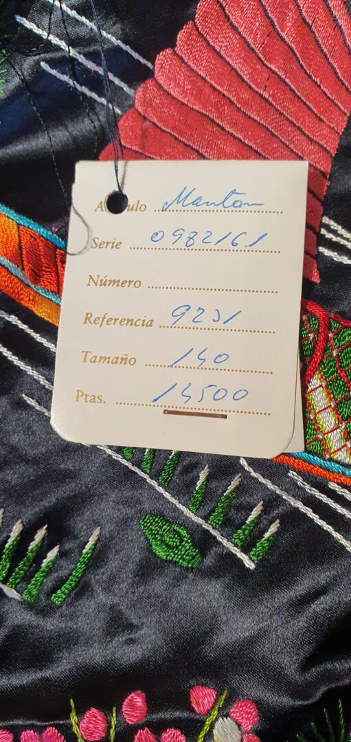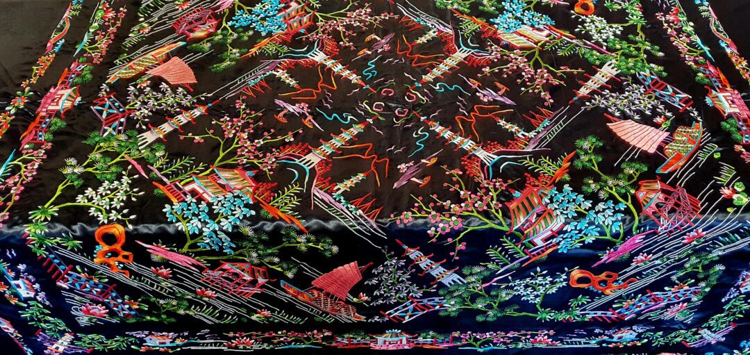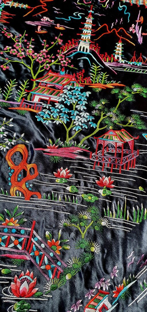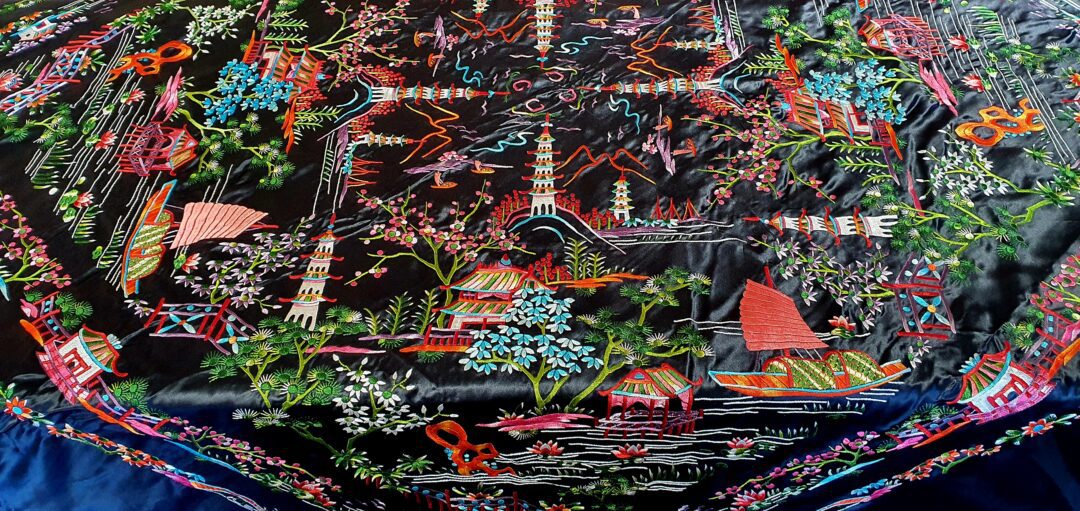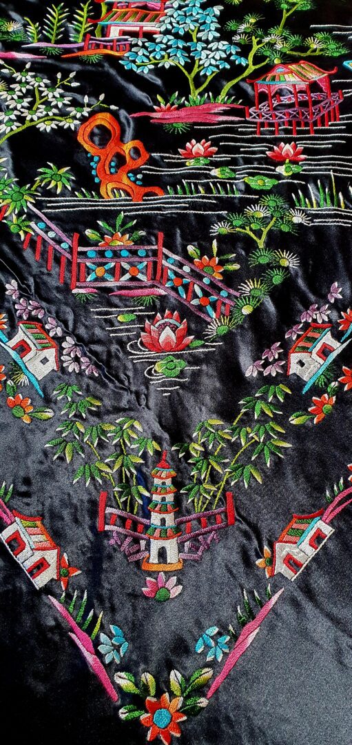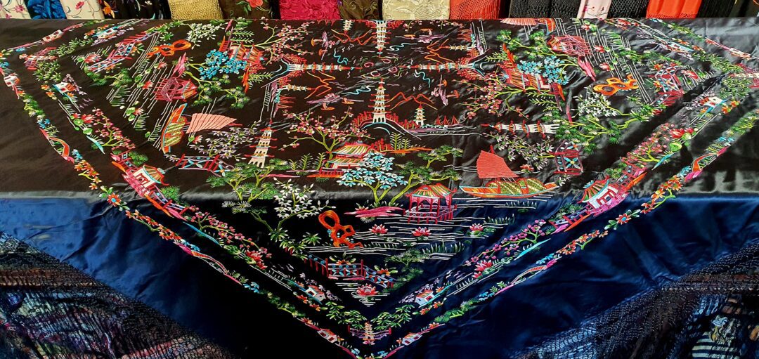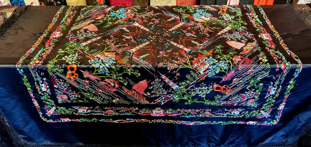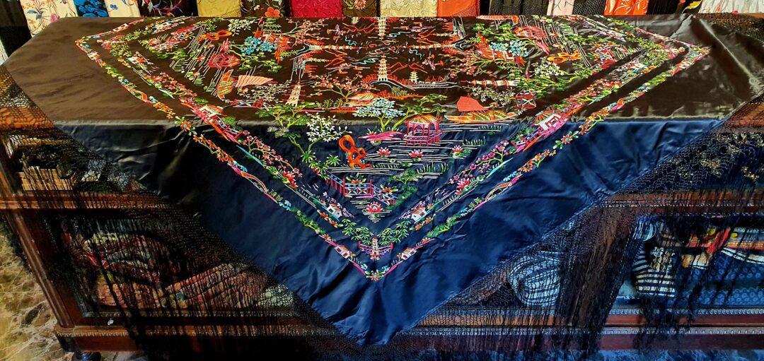 Precioso mantón chinesco en raso bordado a mano en los años 70. Mide 140 cm de lado más enrejado y fleco.