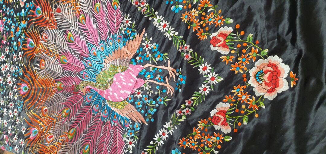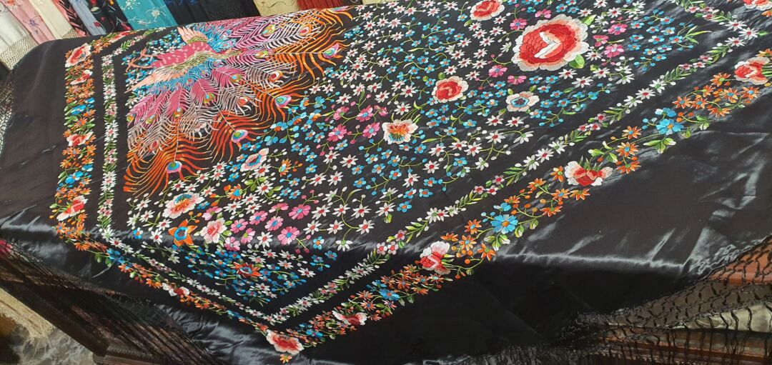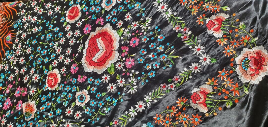 Mantón de raso bordado a mano en 1970, dos mantones en uno, pavo o flores