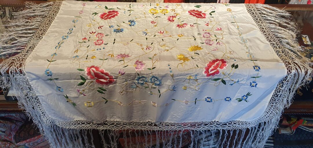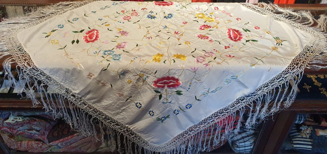 Mantoncito en crepé de seda bordada a máquina. Mide 96 cm de lado más enrejado y fleco