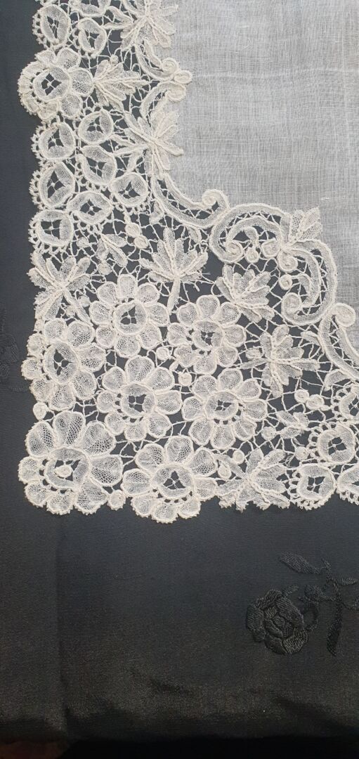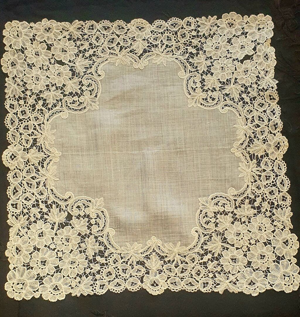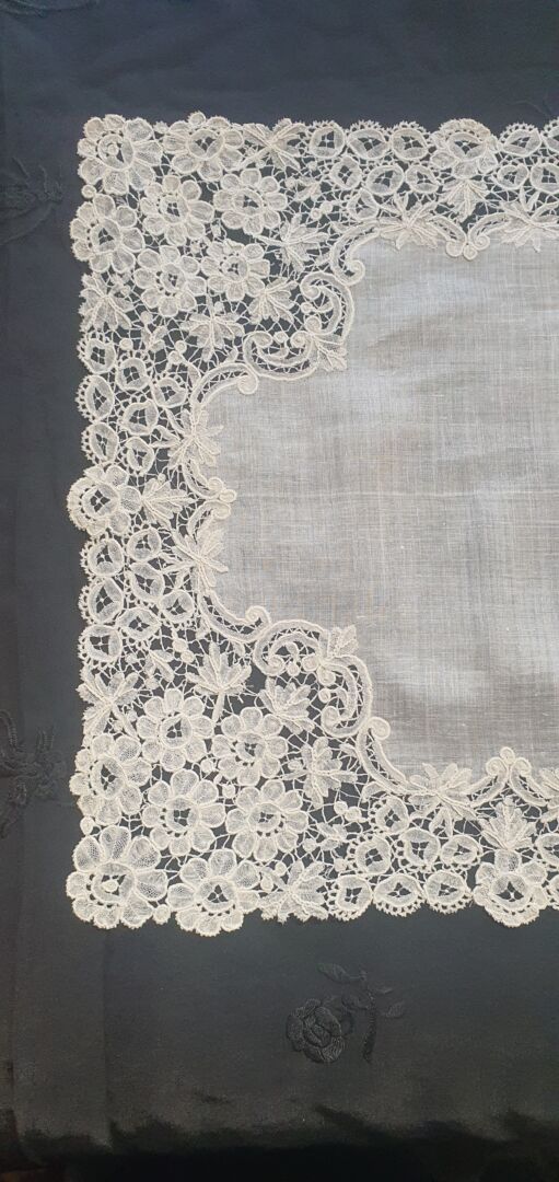 Pañuelo antiguo de batista de Holanda y encaje duquesa. Mide 35 cm